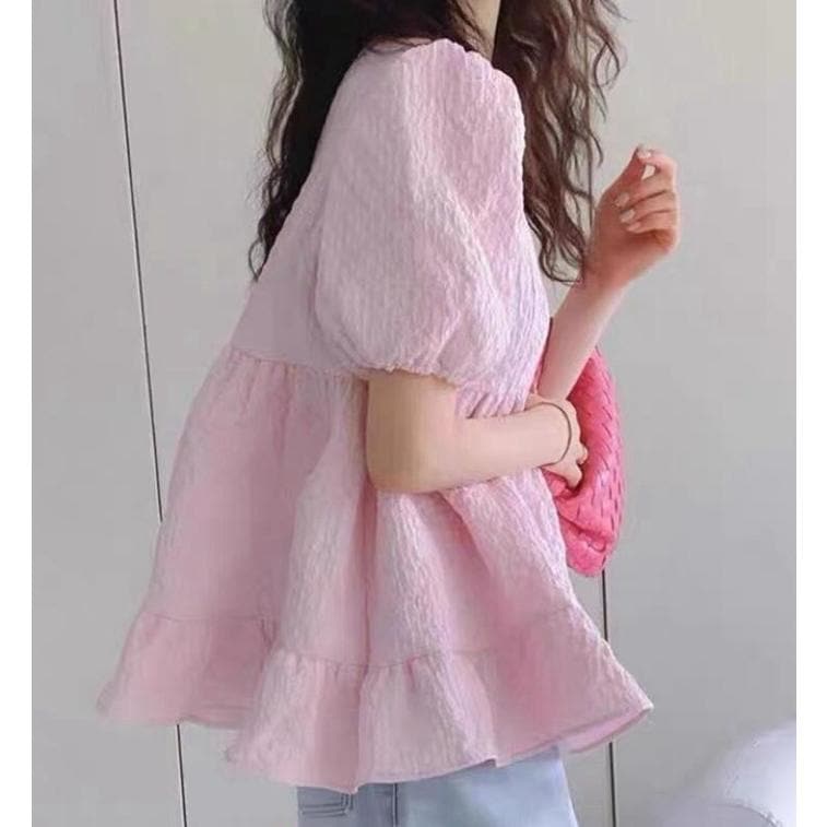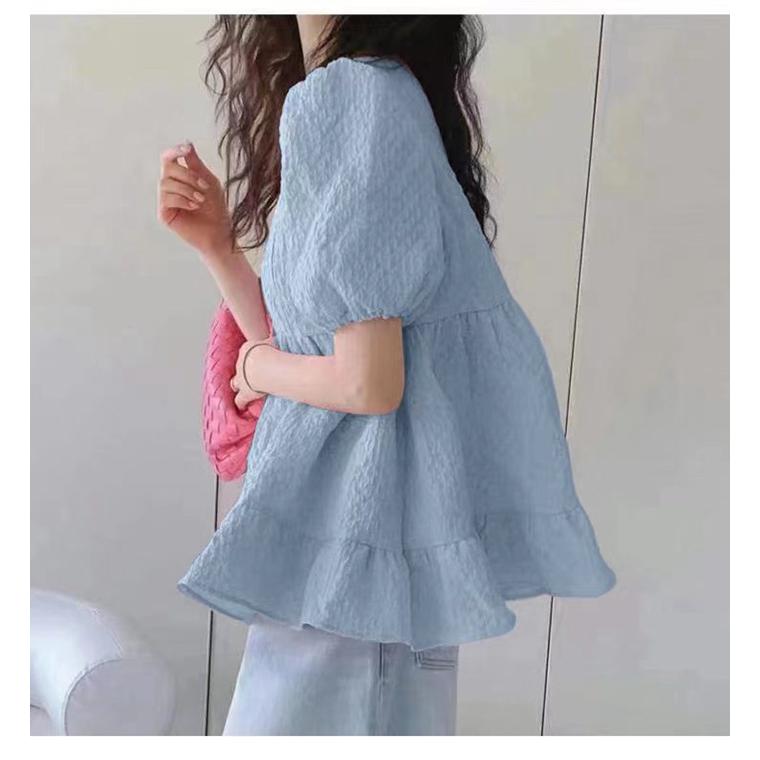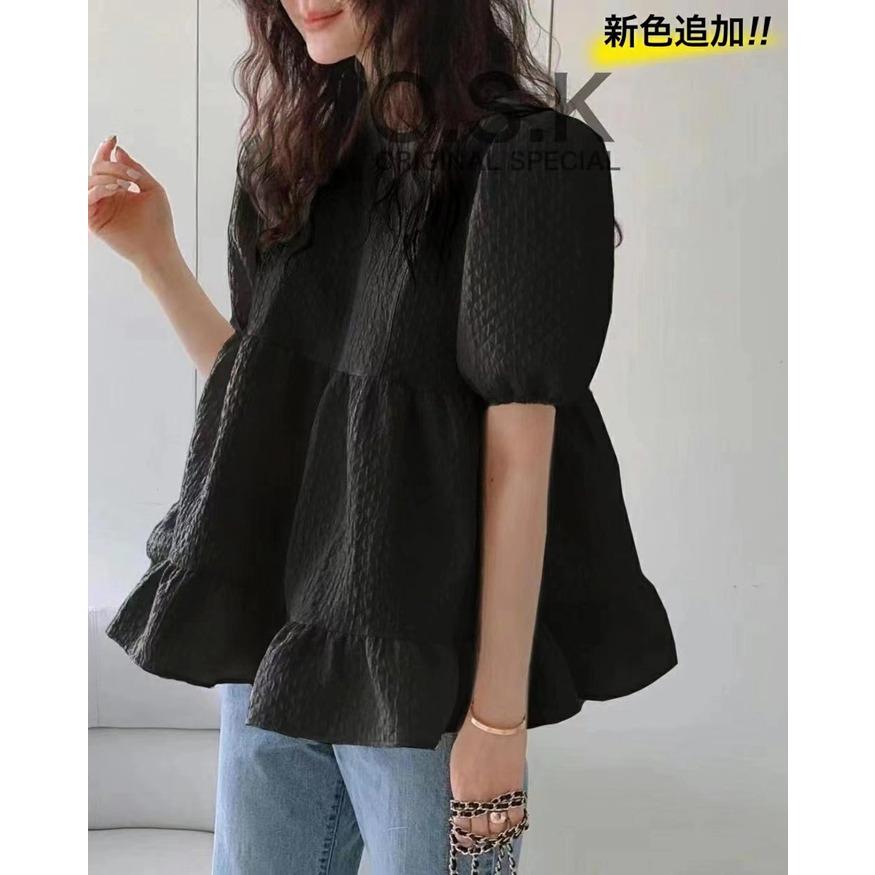 ジャガードブラウス エンボス加工 Aライン 裾フリル ブラウス バルーン袖 新入庫 半袖 無地 トップス 春 夏 レディース フレア