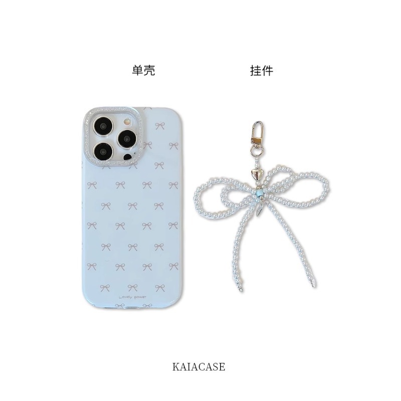 ミルキーブルーのシンプルなパールリボンiPhone携帯ケースiPhone 13/14/15/16 pro max韓国 流行り Apple