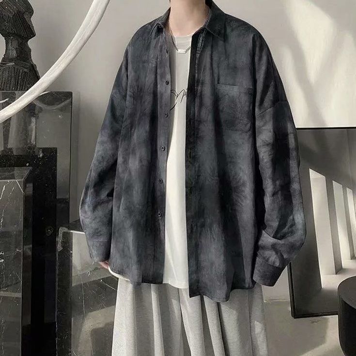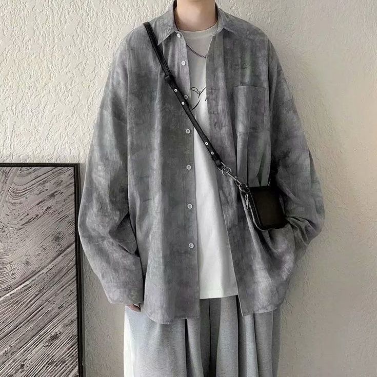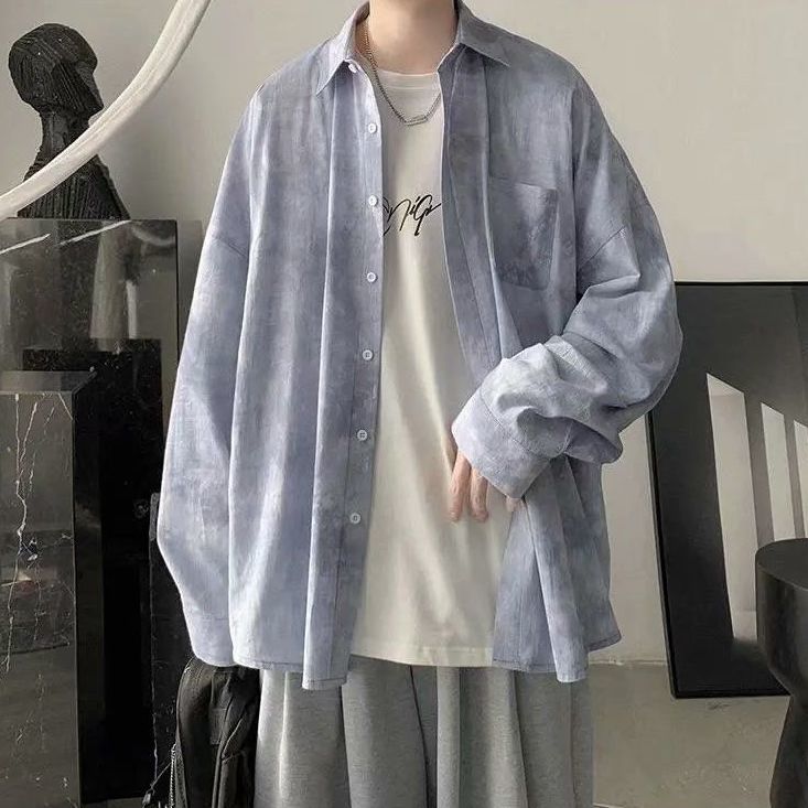 【2枚購入で100円OFF】さらっと羽織れるサテンシャツタイダイシャツ男性緩い夏新しい長袖韓国語版トレンドシャツ