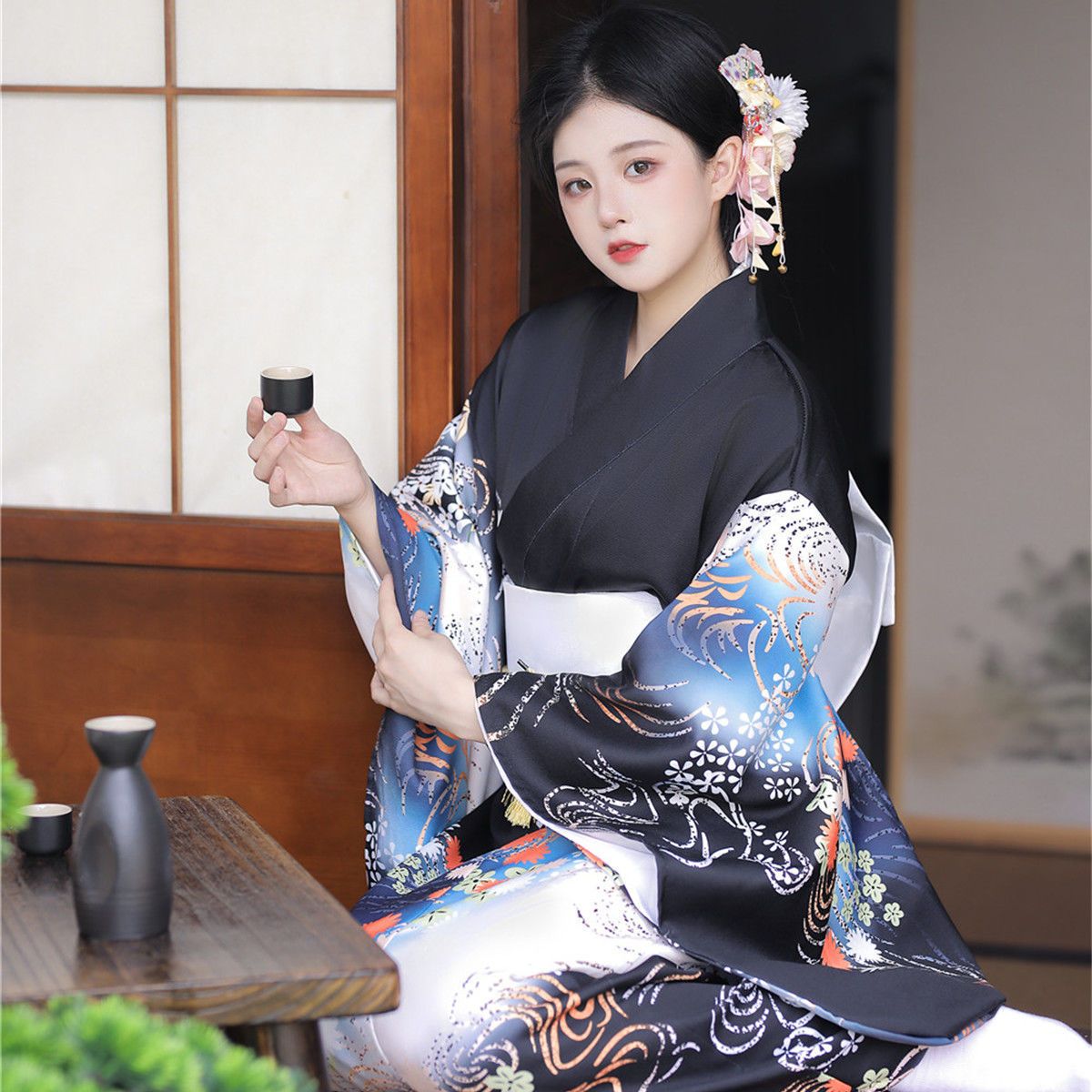 着物女性の暗い修正された雰囲気の和風写真撮影自撮りスタジオの服装