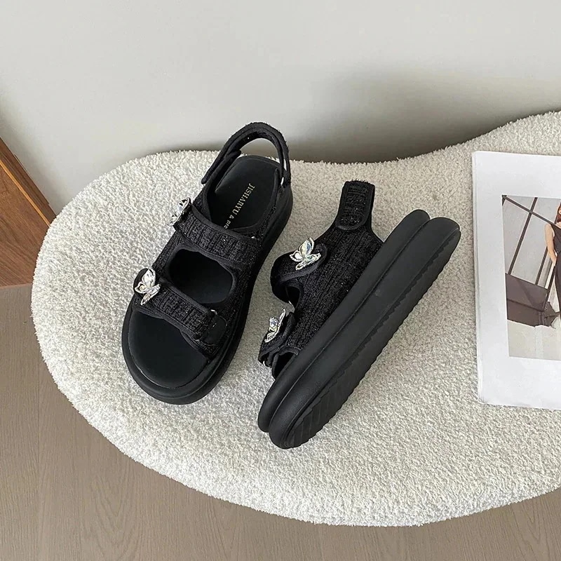 Qoo10限定 ワンタッチマジックテープ 大きいサイズの婦人靴フラッシュドリルリボンマジック貼り厚底サンダル(ダイヤモンドバタフライデザイン)