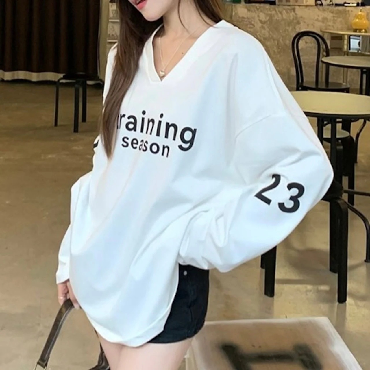 2024 秋冬トップス スウェット 長袖 Vネック 英語 数字 23 ゆったり 秋 白 おしゃれ かわいい 韓国ファッション レディース お出かけ