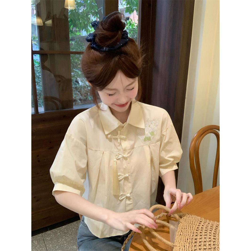 チャイナ風 シャツ ポロシャツ レディース 甘い バブルスリーブ トップス 夏新作 半袖シャツ 体型カバー ショート丈 ブラウス 上着