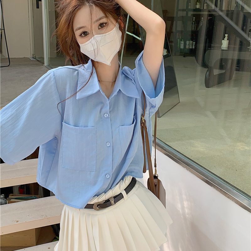 高級感 無地 半袖シャツ トップス ゆったり カジュアル ポロネック ブラウス 体型カバー レディース ショート丈 カーディガン 上着