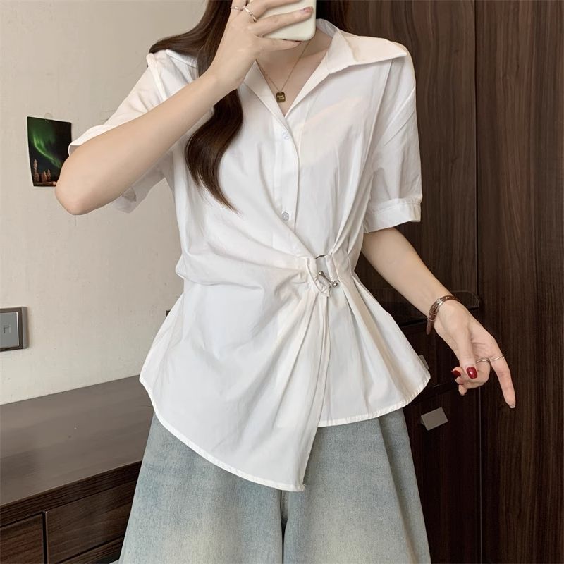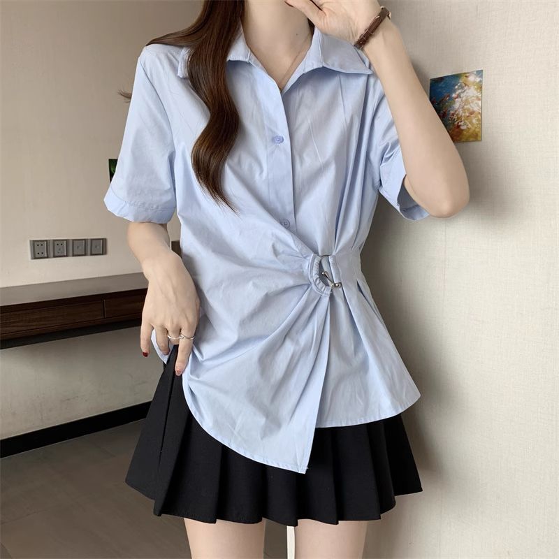 フレンチ ウエスト引き締め シャツ トップス レディースファッション デザイン感 半袖ブラウス スリミング 百掛け イレギュラー トップス