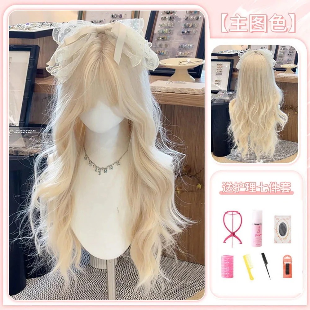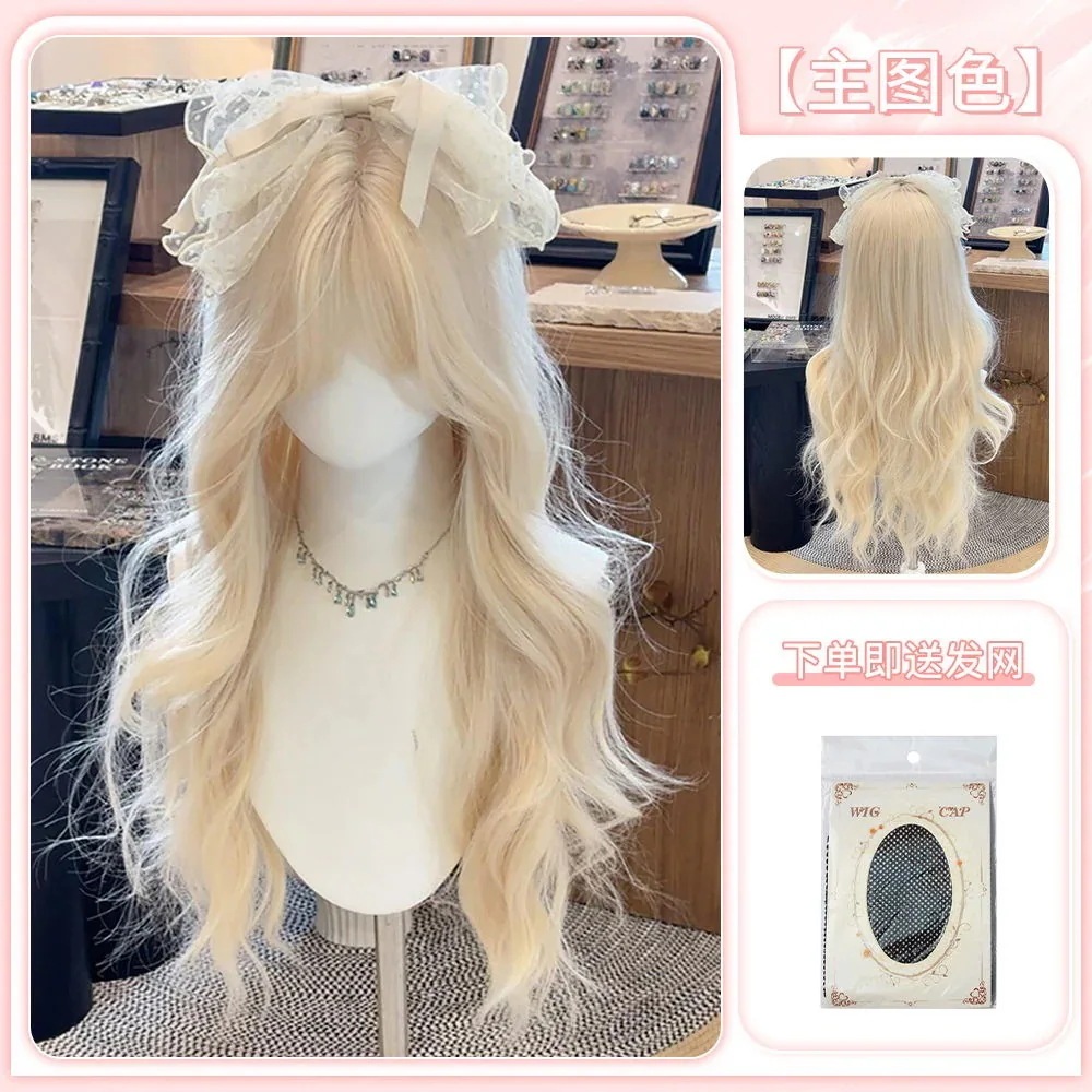 薄いロングヘア クリーミーブロンド ロリータロングカーリーヘア ナチュラルウィッグセット ウィッグ ウィッグ ロング 前髪ウィッグ メイド服 サンタコス コスプレ クリスマスコスチューム