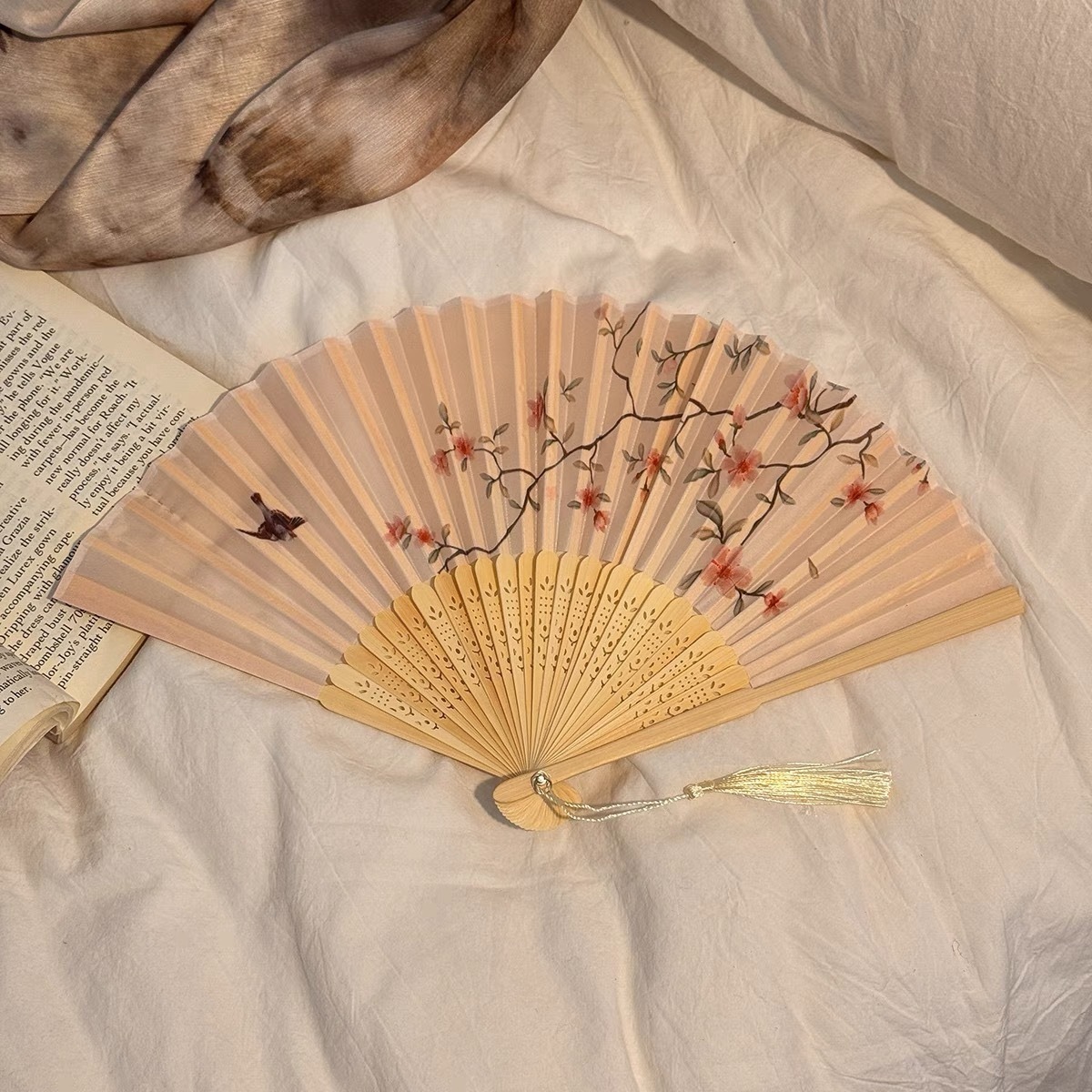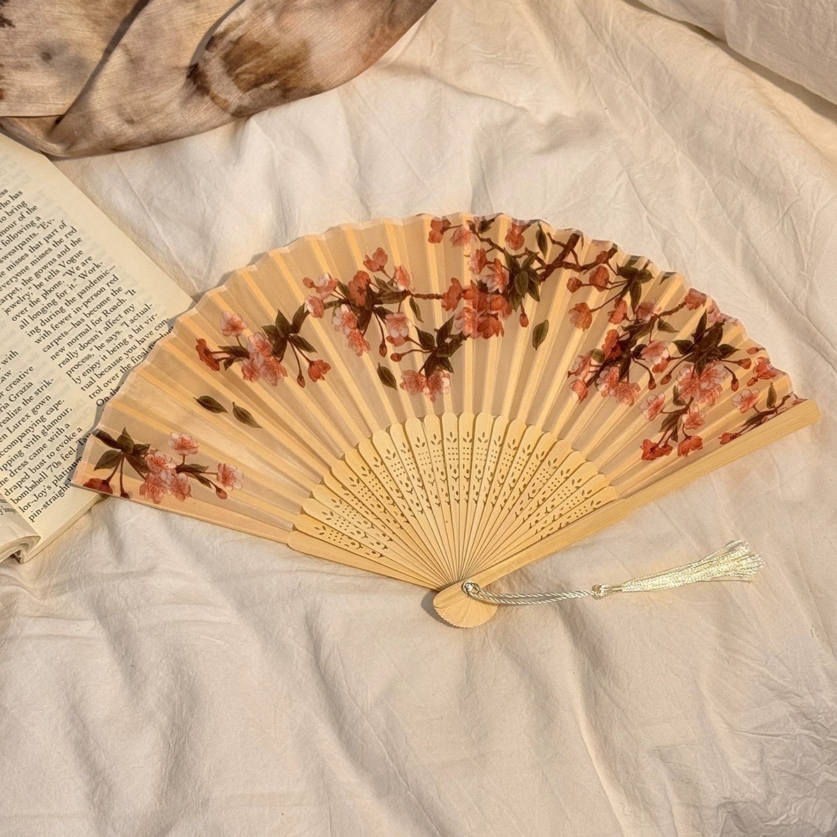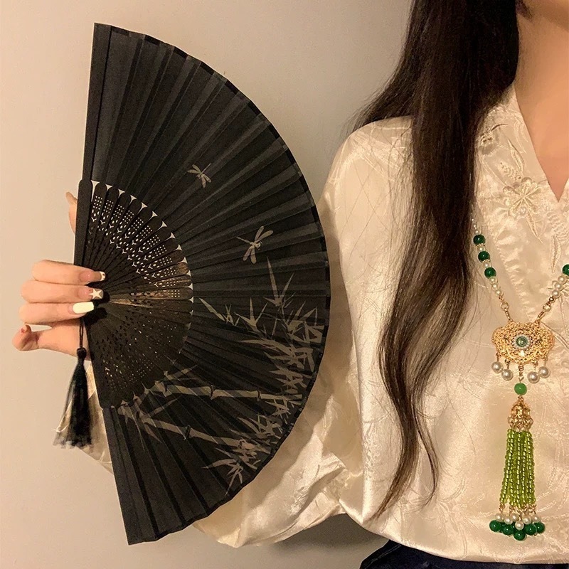 夏のポータブル小さな竹製扇子新しい中国の古代の折りたたみ式扇子古代スタイルのレトロな気質の折りたたみ式タッセルプリント扇子