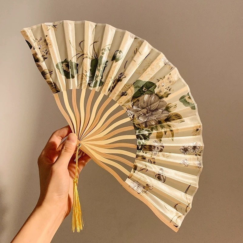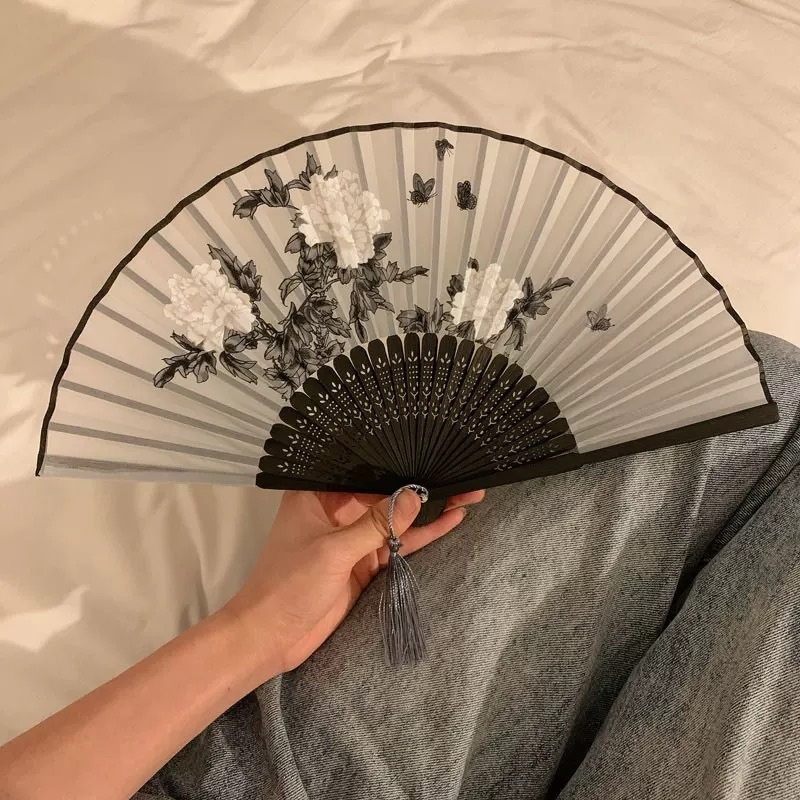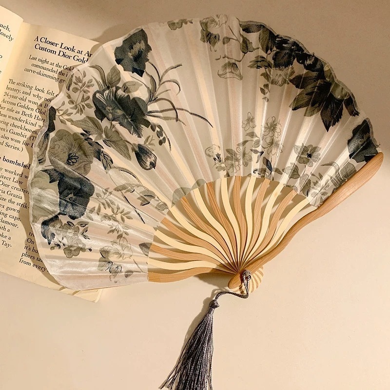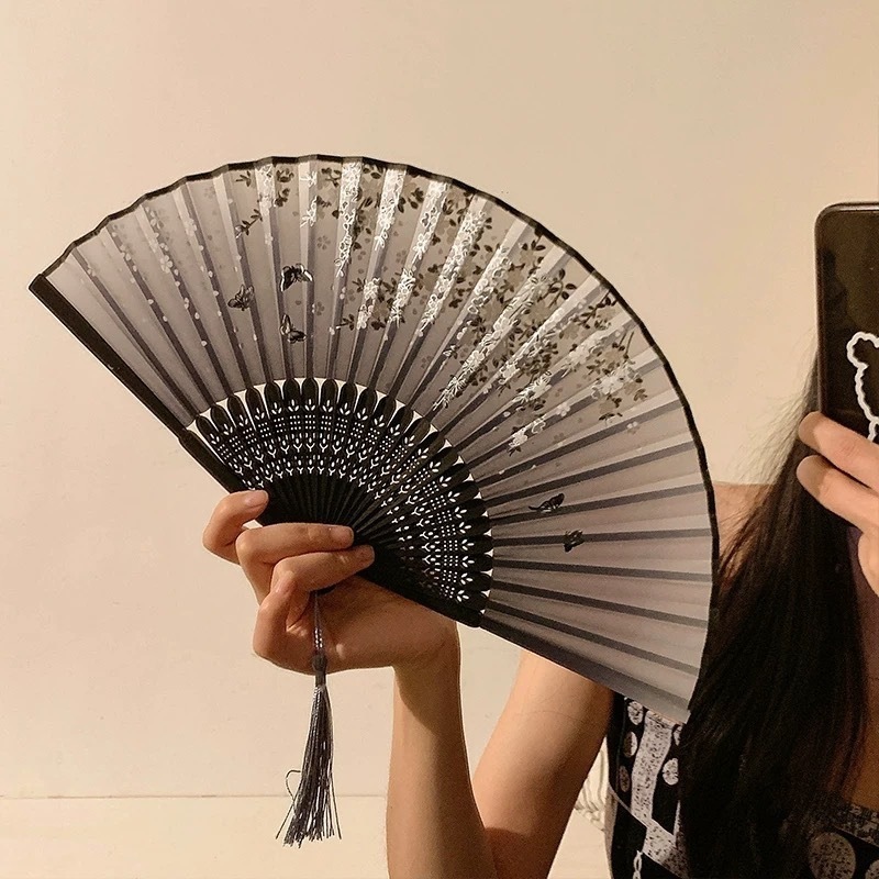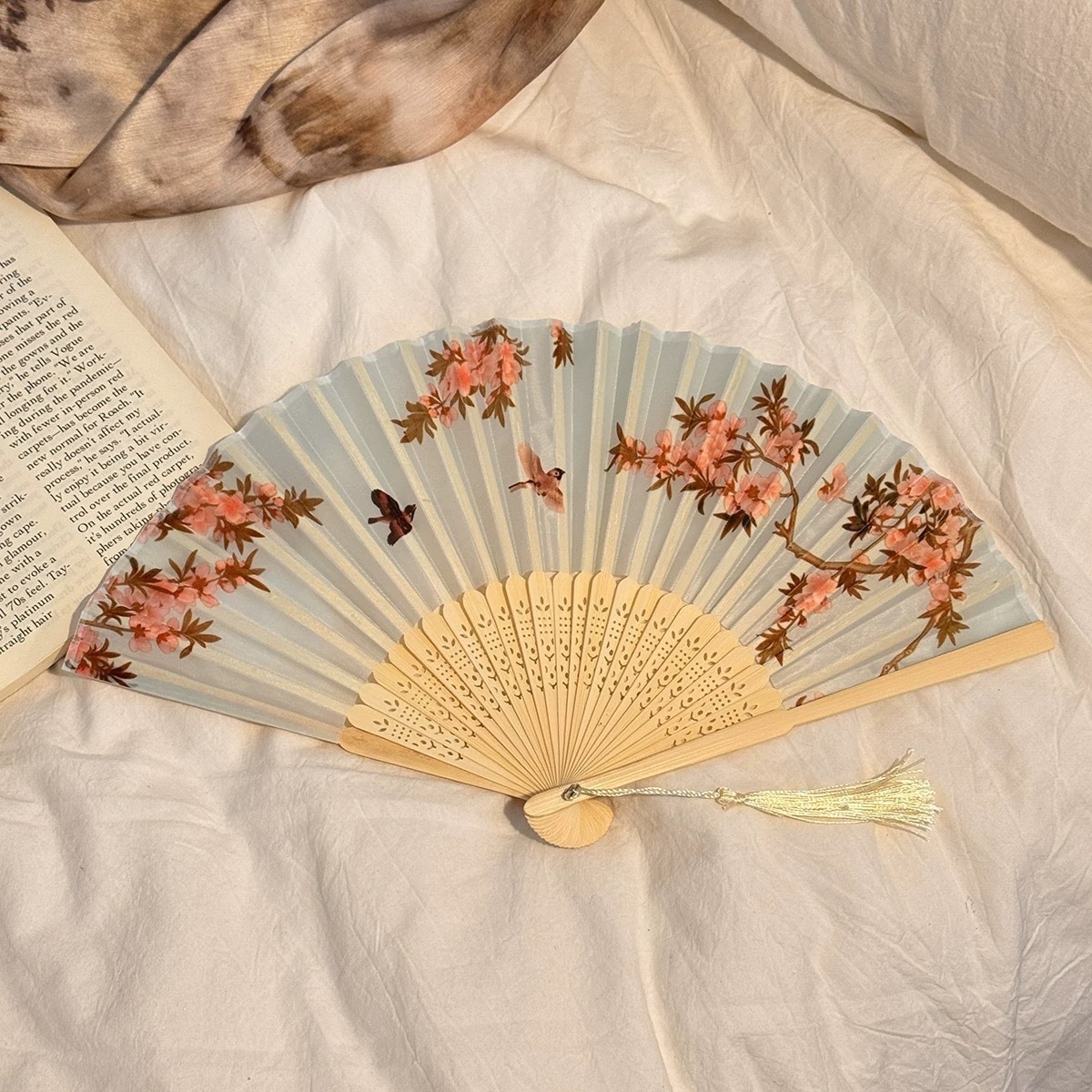 夏のポータブル小さな竹製扇子新しい中国の古代の折りたたみ式扇子古代スタイルのレトロな気質の折りたたみ式タッセルプリント扇子