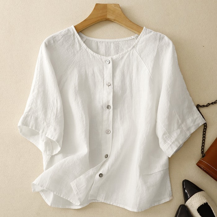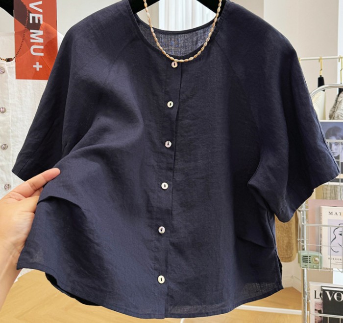 シャツ ブラウス ラウンドネック 綿麻 レディース Tシャツ 半袖 無地 夏 トップス 通気 薄手
