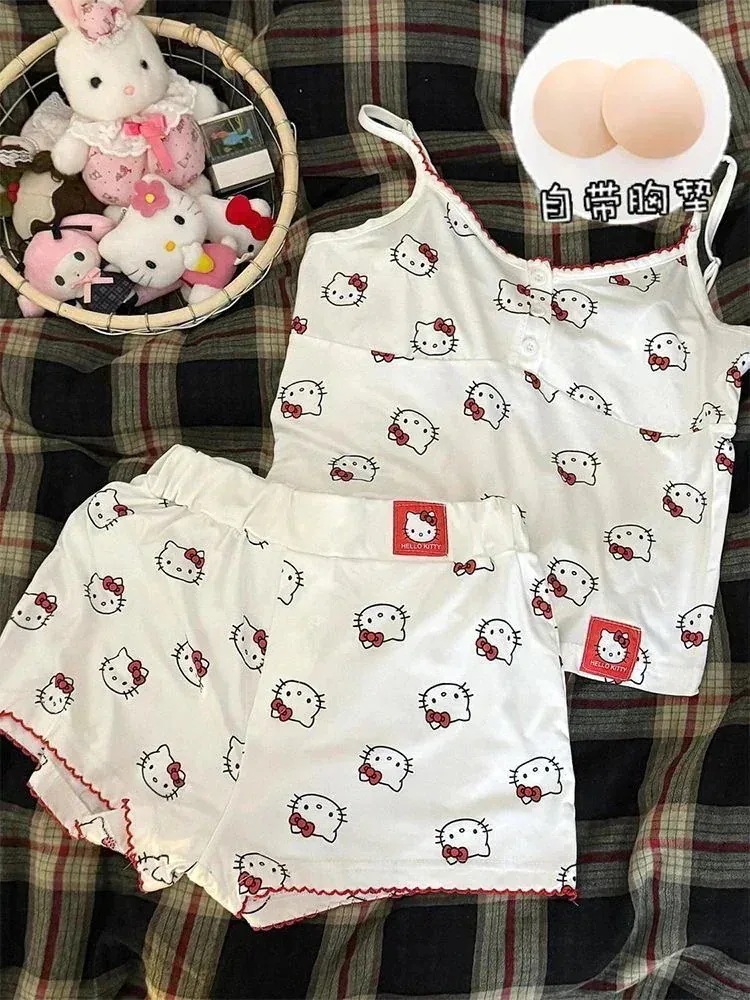 【迅速な出荷】ハローキティキャミソールパジャマセット女性用胸当て付き甘姫風ふんわり可愛いセットお部屋着誕生プレゼント夏パジャマ