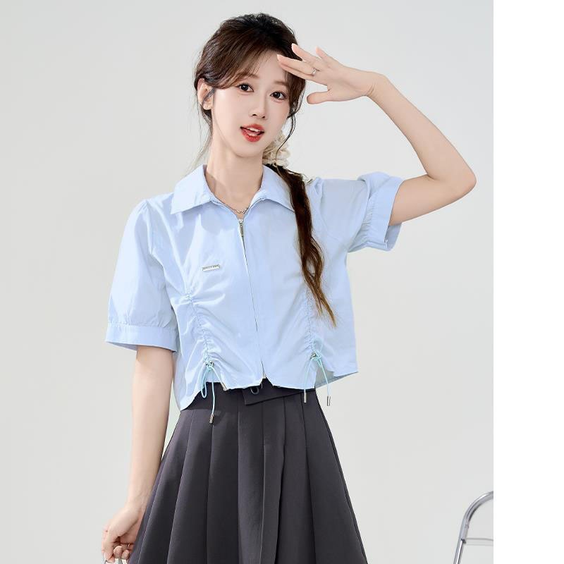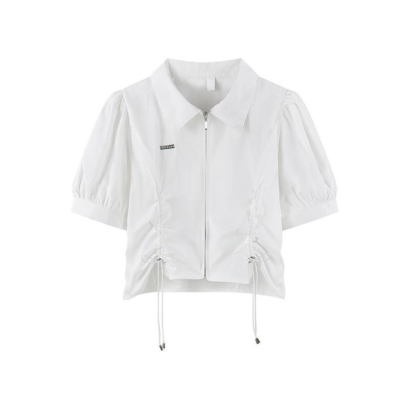 夏新作 ファスナー シャツ おしゃれ パフスリーブ トップス 半袖ブラウス カジュアル トレンド ショート丈 カーディガン 体型カバー
