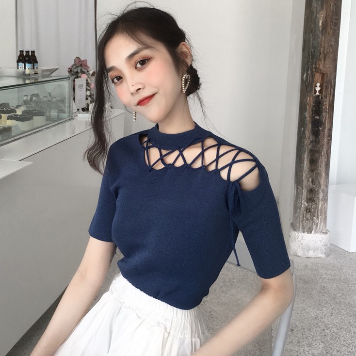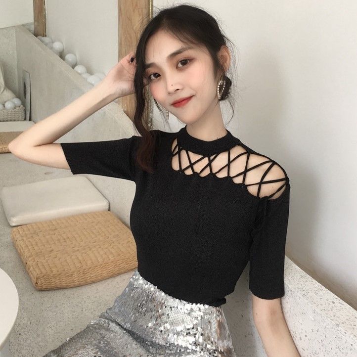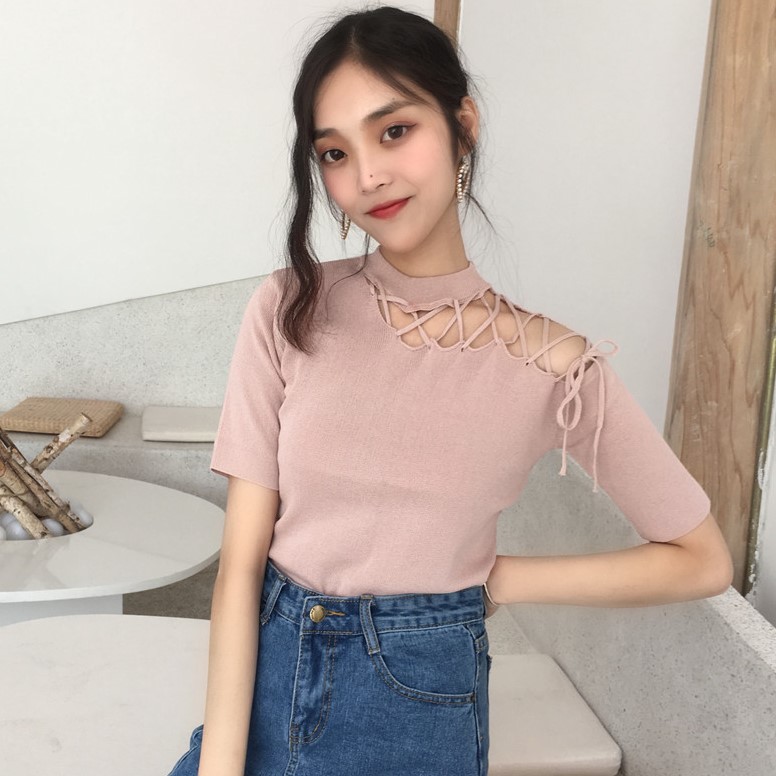 韓国ファッション 透かし彫り 半袖Tシャツ ブラウス 無地 夏服 ニットトップス プルオーバー レディース スリミング カットソー Tシャツ