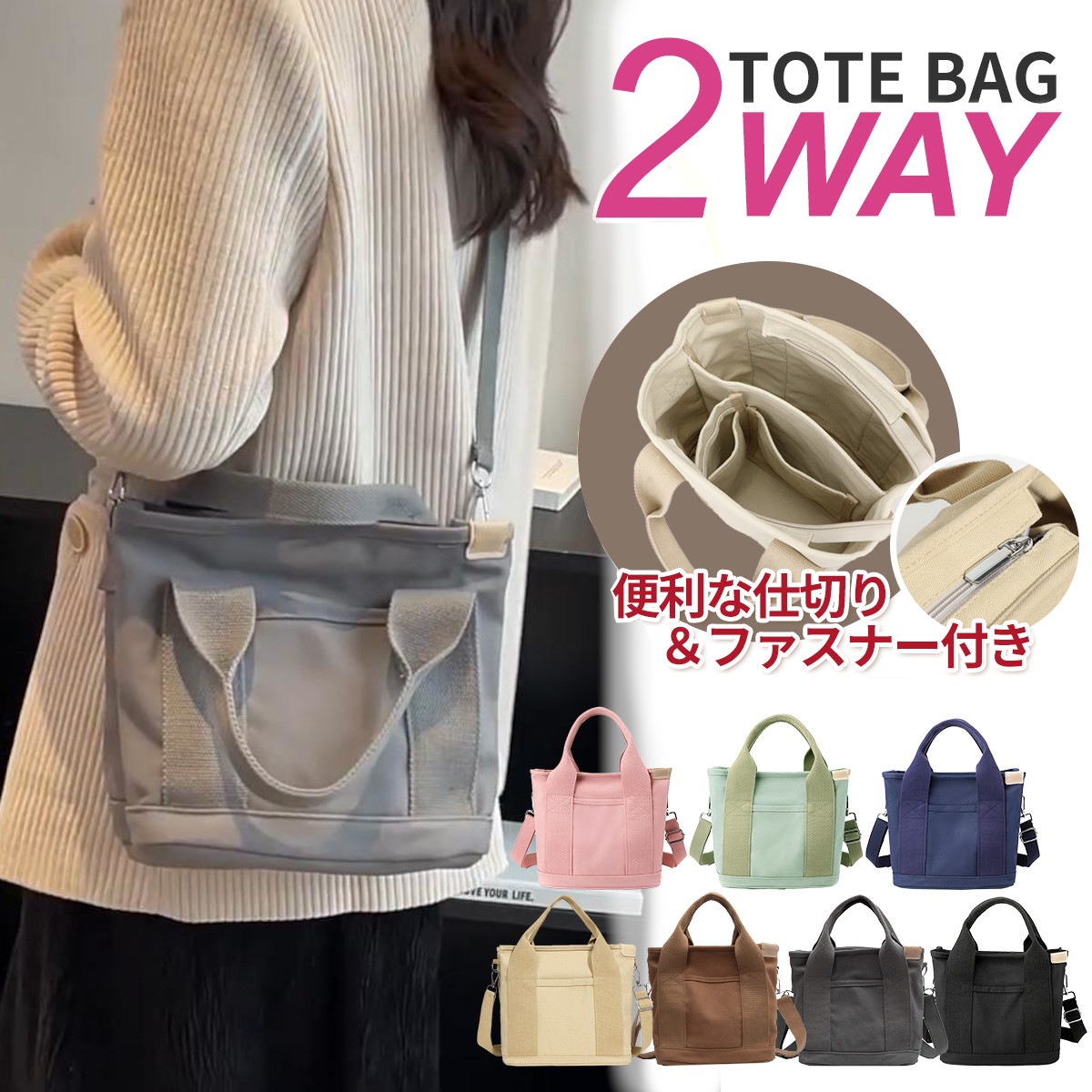 トートバッグ 小さめ レディース 帆布 ミニトートバッグ 仕切り 2way ポケット多い ショルダー ファスナー付き 大容量 かわいい キャンバス