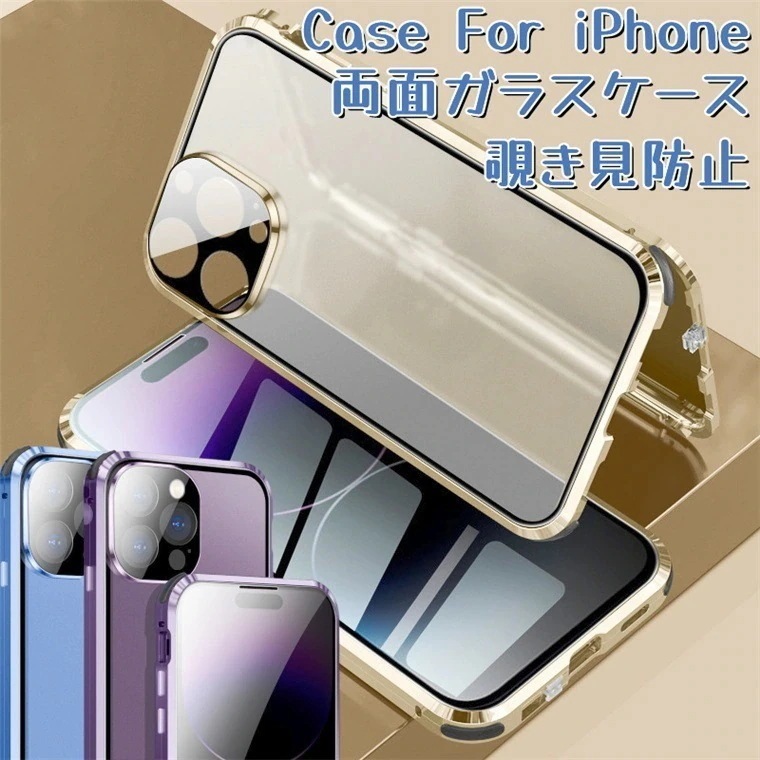 iPhone15Pro両面ケースガラスiPhone14Plusケース覗き見防止14ProMaxカバーiPhone15アルミバンパー両面ガラス磁石吸着クリア耐衝撃