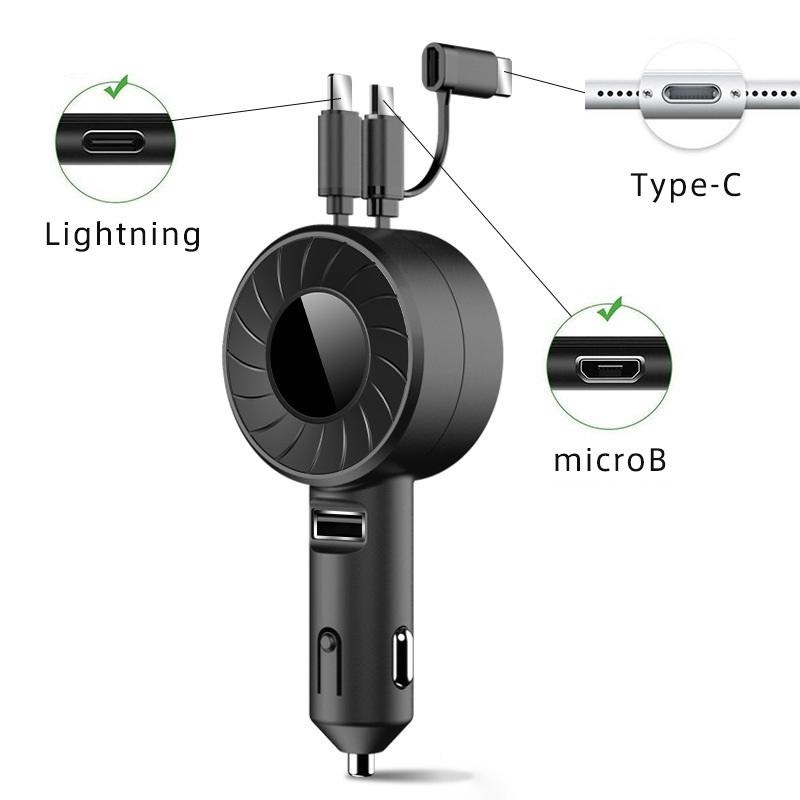 シガーソケット カーチャージャー 車載 充電ケーブル 充電器 3in1 リール式 スマホ充電 急速充電 シガーチャージャー 伸縮ケーブル USB充電