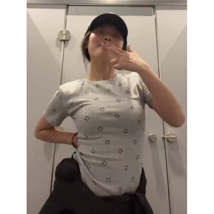 [210g 40s純綿]スマイリーフェイスプリント半袖Tシャツレディーススリムフィットショートトップグレーアメリカンスタイル