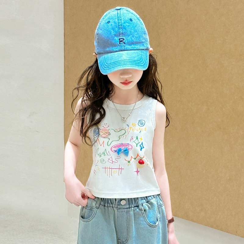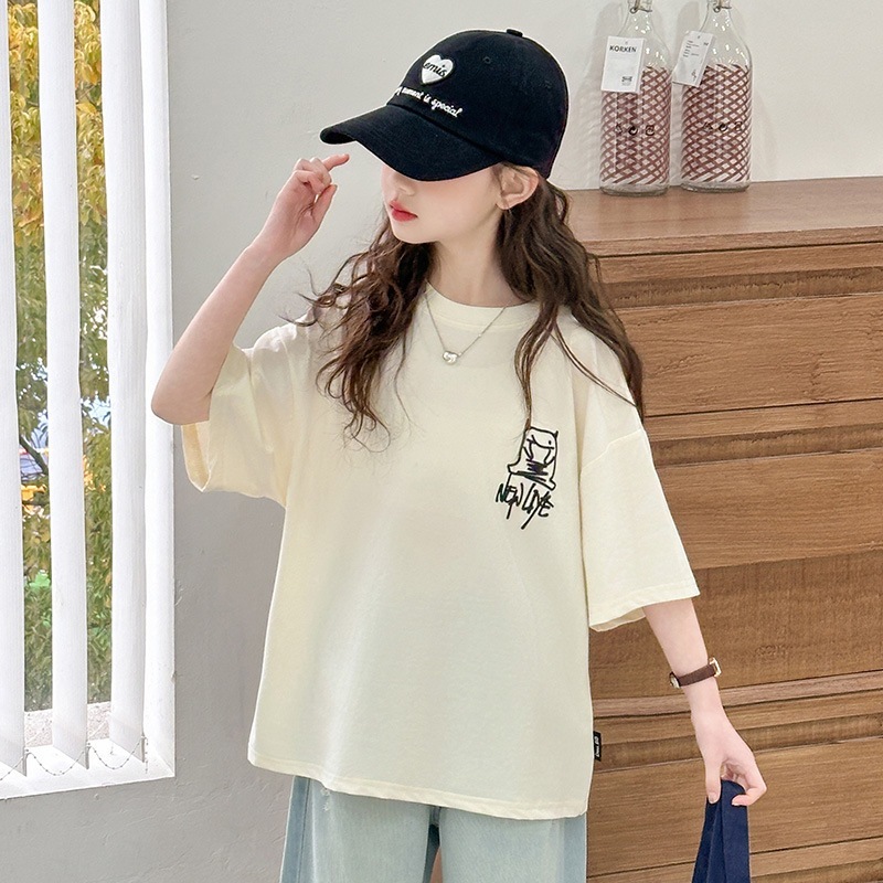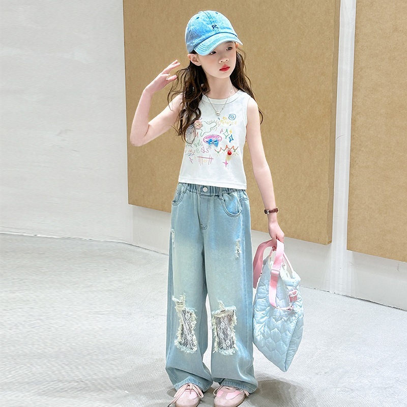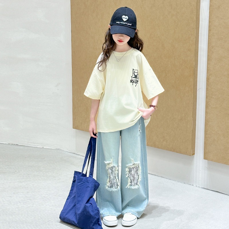 女の子の夏服 2025年新作 漫画モンスター 半袖Tシャツ ビッグガール 破れジーンズ ツーピーススーツ
