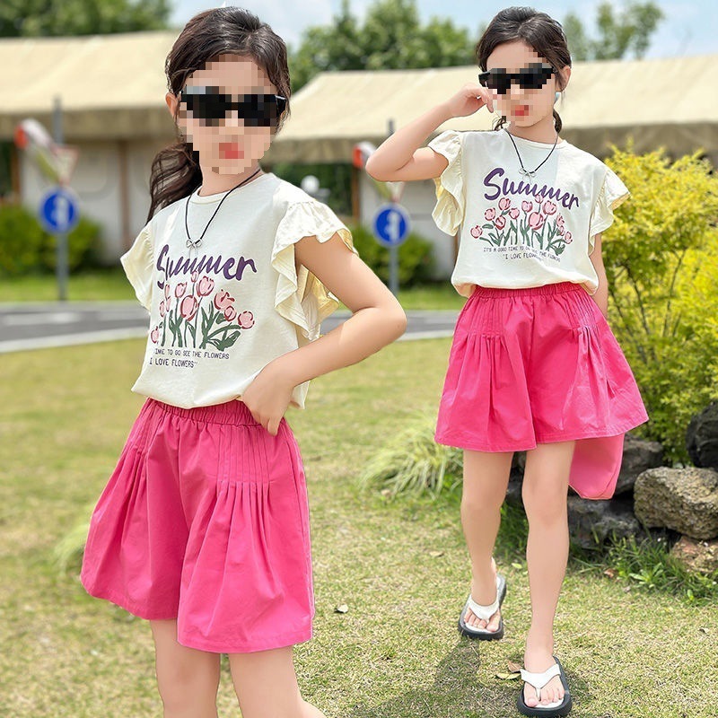 女の子の夏のスーツ2025新しい子供のファッショナブルな半袖の夏服カジュアルな女の子のスタイリッシュなツーピースのスーツの写真と色