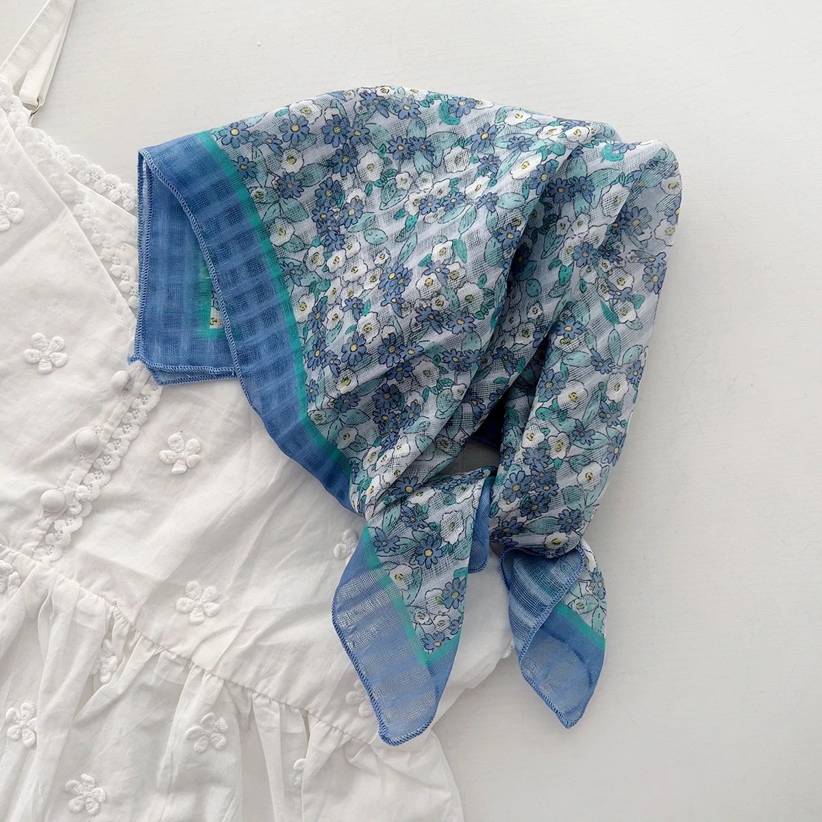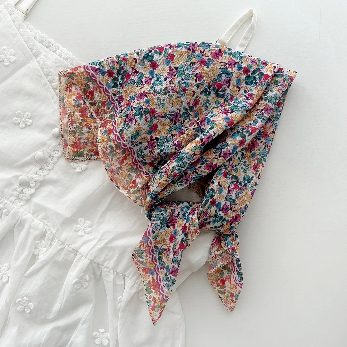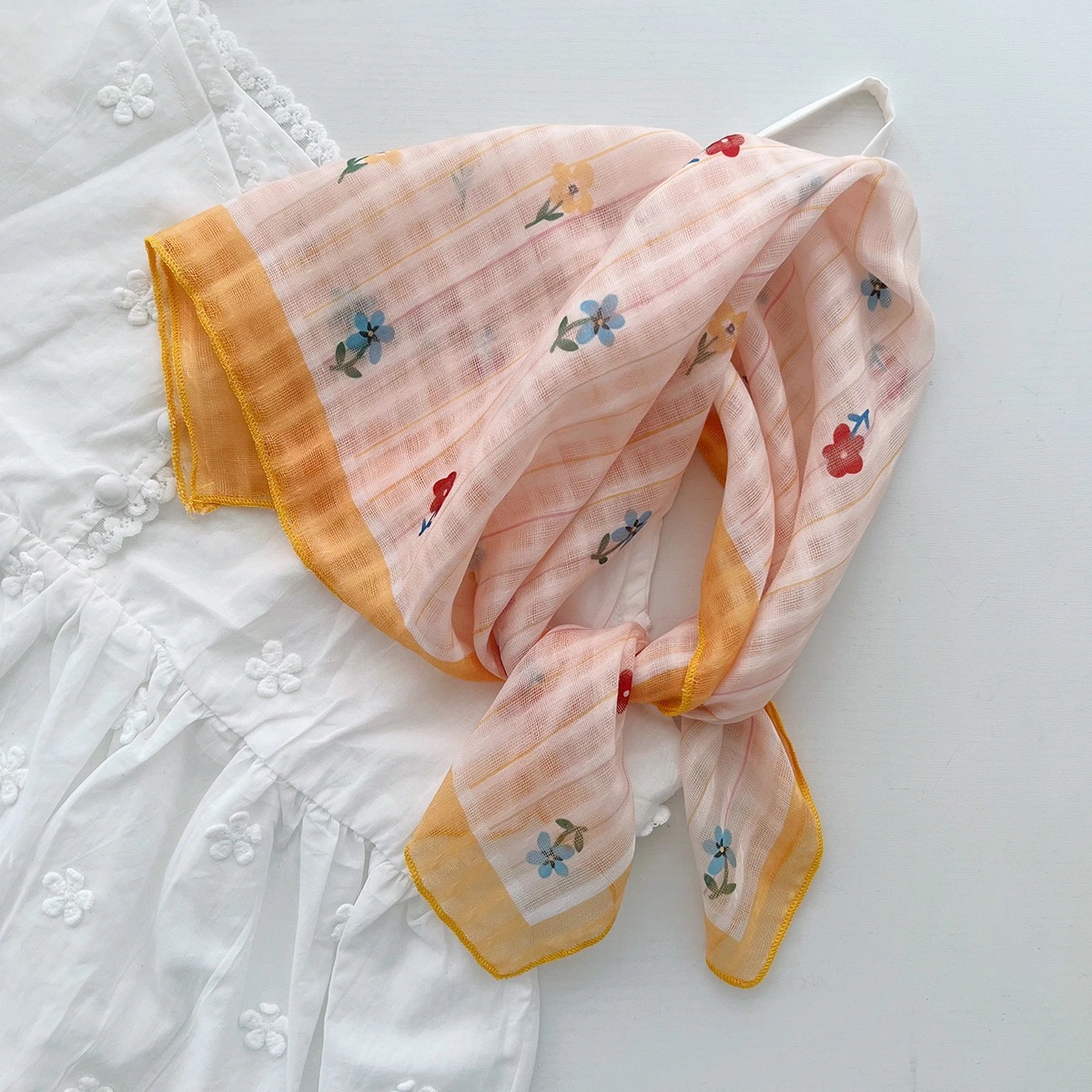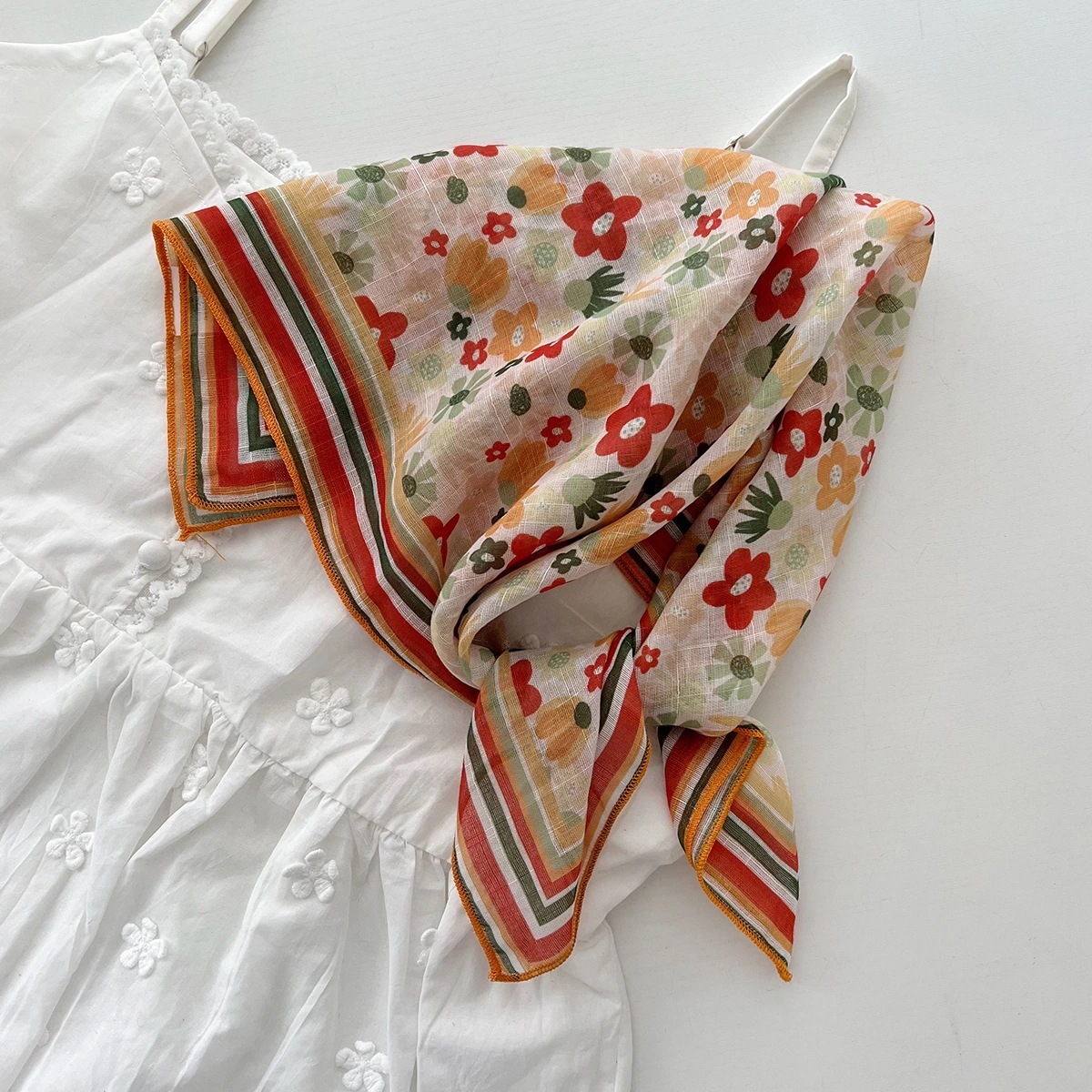 韓国 ins スタイル新しい花小さな正方形のスカーフの女の子 綿と麻のラップヘッドスカーフシルクスカーフは髪の小さなひらひら装飾ネッカチーフシルクスカーフを結んだ