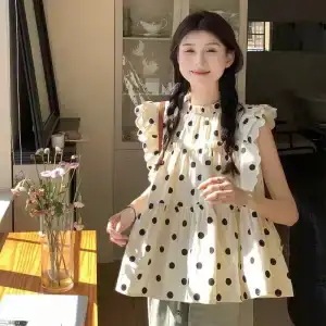 新作Tシャツ 半袖 パフスリーブ 甘い水玉模様のシャツの女性の夏2025新しいシックなシャツのトップス