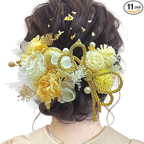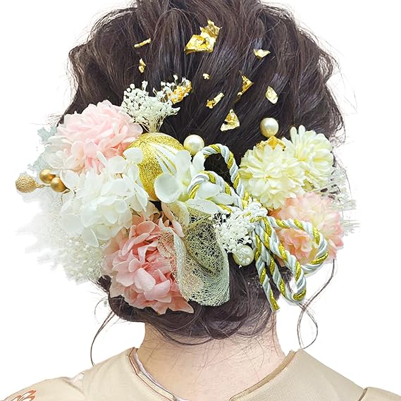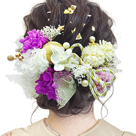 JZOON髪飾り 成人式 人気 ドライフラワー ヘアアクセサリー 振袖 着物 卒業式 入学式 発表会 袴 結婚式 七五三 浴衣 和装 結納 かすみ草 網 高級造花 リボン 紫陽花 和玉 金箔 手作り 前撮り