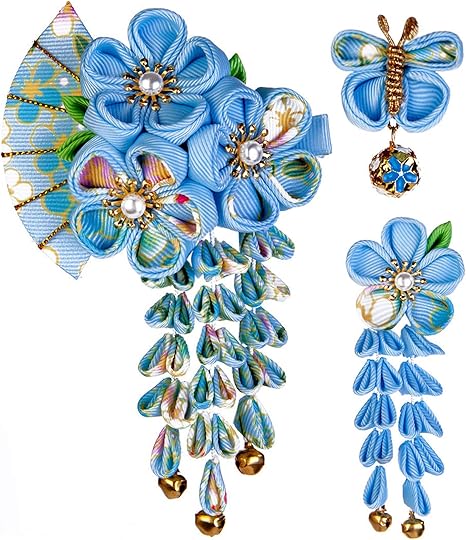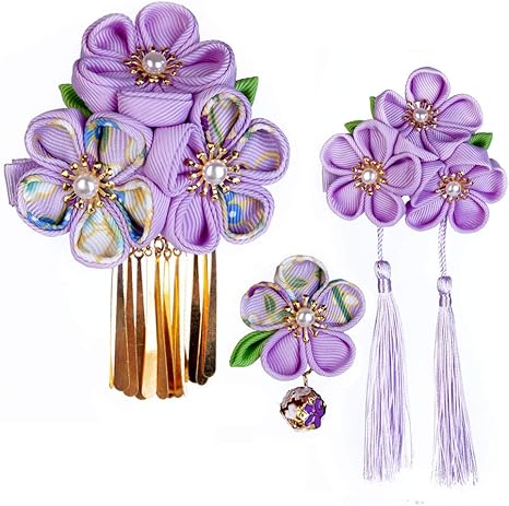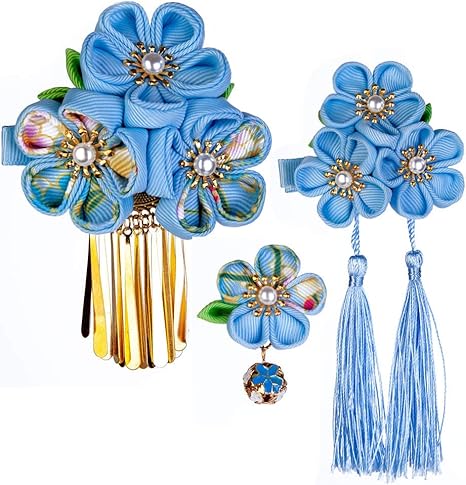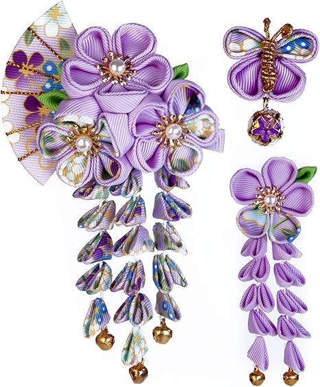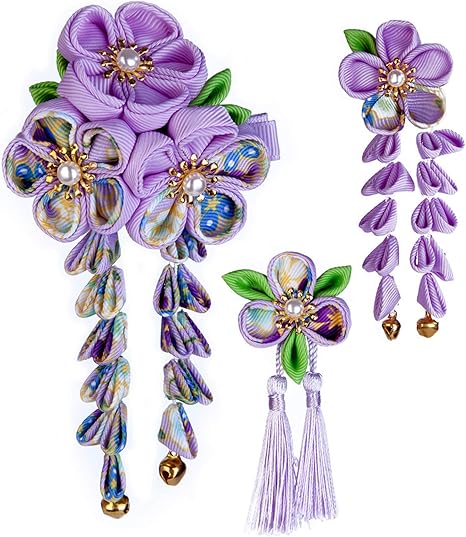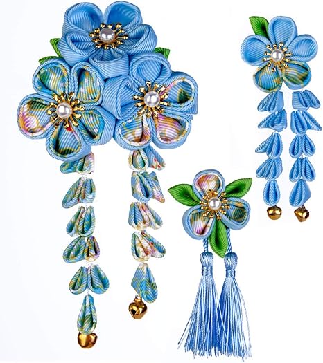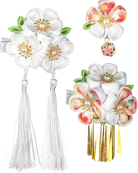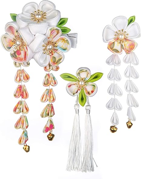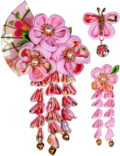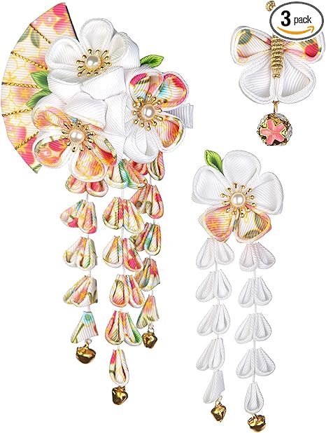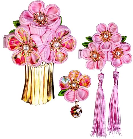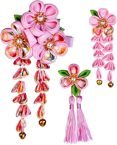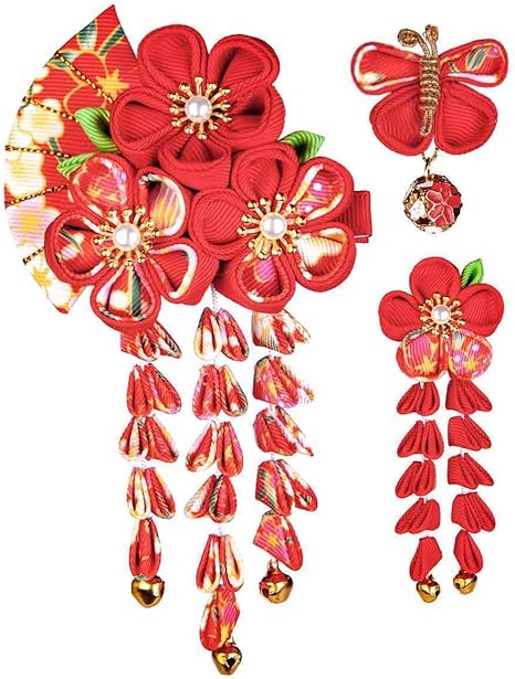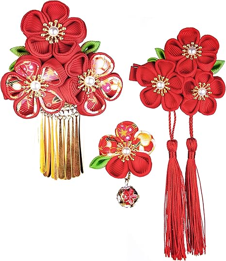 JZOON髪飾り3点セット 成人式 七五三 浴衣 袴 着物 振袖 和装 つまみ細工 花 卒業式 結婚式 鈴付き 手作り 赤B 5色全15選