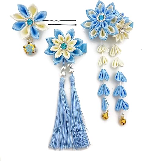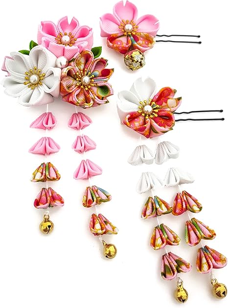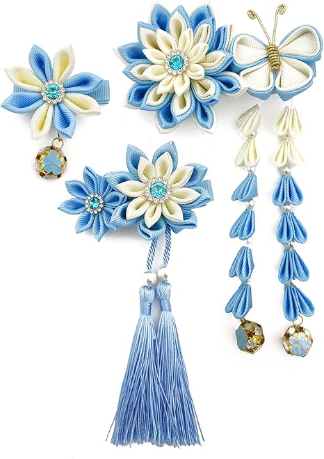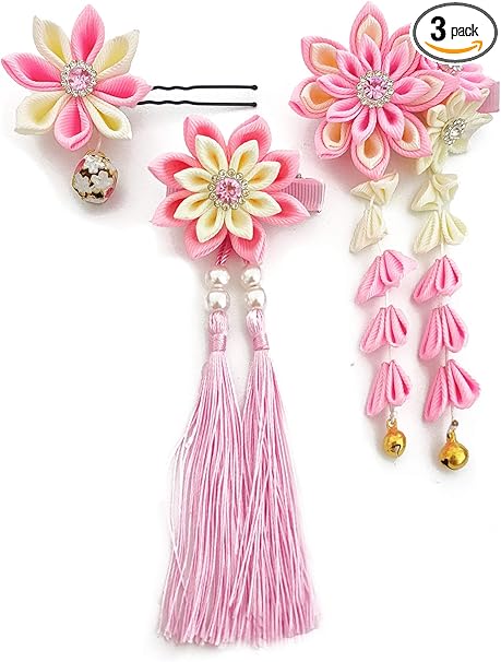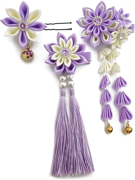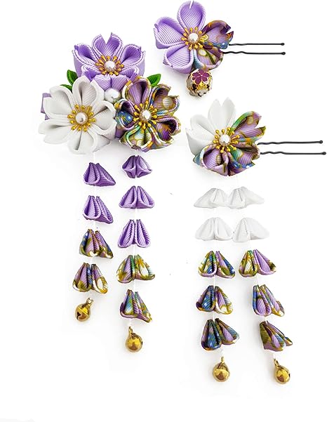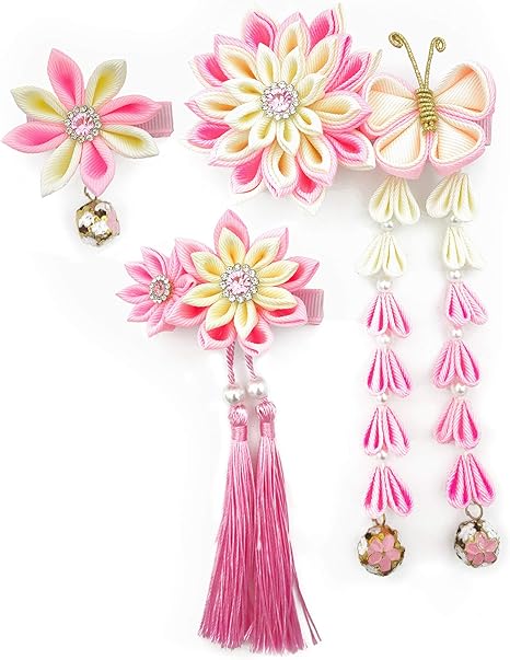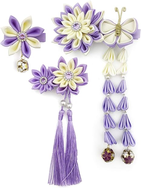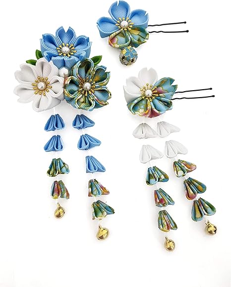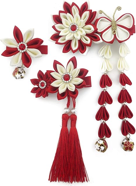 JZOON髪飾り菊桜蝶 3点セット つまみ細工 成人式 七五三 浴衣 袴 着物 振袖 和装 花 卒業式 結婚式 鈴付き 手作り 赤 青 紫 ピンク 4色 菊 桜 蝶 全12選