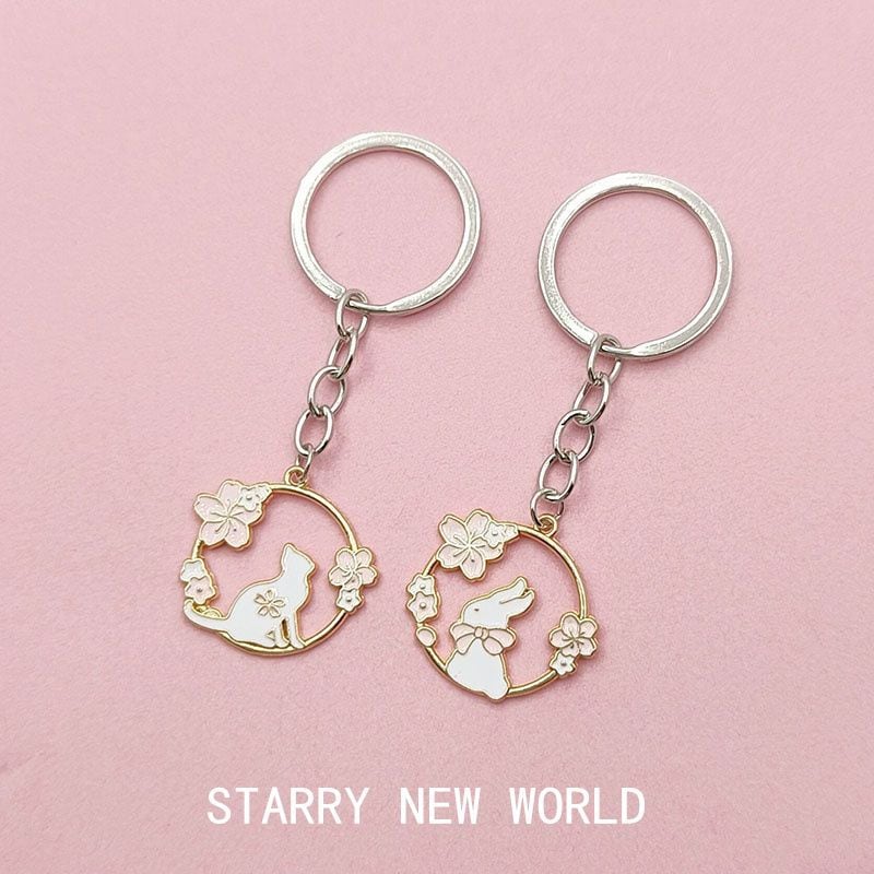 キーホルダー キーリング キーカバー 漫画の桜の白いウサギのキーホルダー 猫キーホルダー 金属製のシンプルなくり抜きバッグ玉ウサギペンダント
