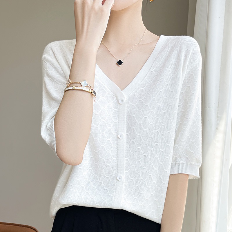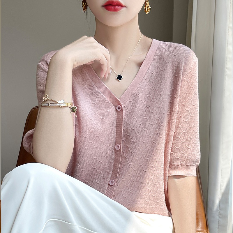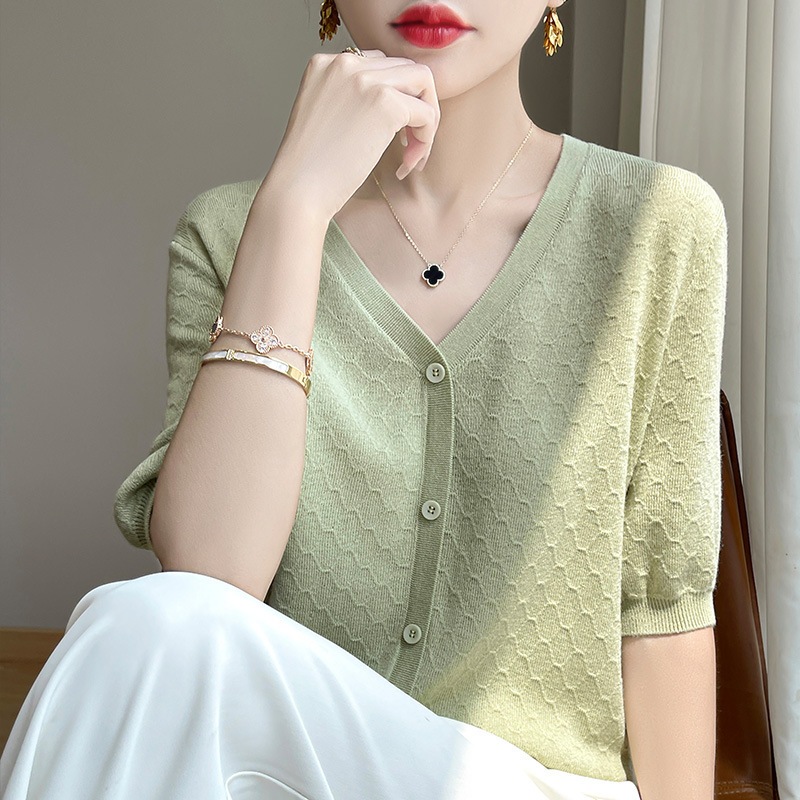 2024年夏テンセルとマルベリーシルクをブレンドしたVネックニット半袖カーディガンゆったりとした着心地で着回し力抜群の無地トップス
