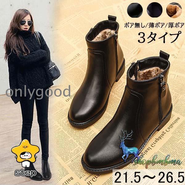 ショート ブーツ レディース 大きいサイズ ショートブーツ サイドジップ ペタンコ ローヒール 歩きやすい 痛くない 脚長 防寒 秋冬 ボア PU ブラック 黒 通勤