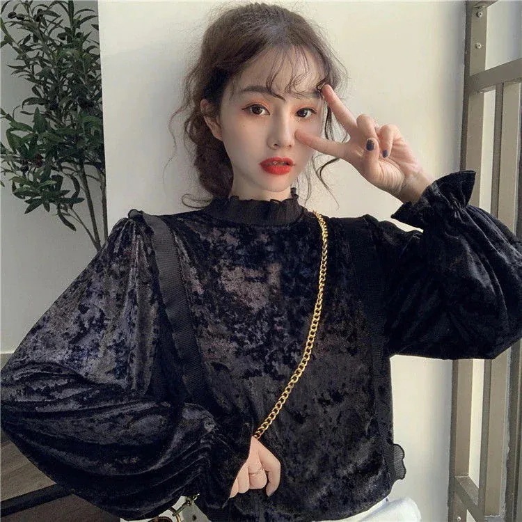 ブラウス 春先取りブラウス気をつけて新型の韓国版のシルクの絨毯の木の耳元は襟の泡の袖の長袖の上着の女性をつなぎま