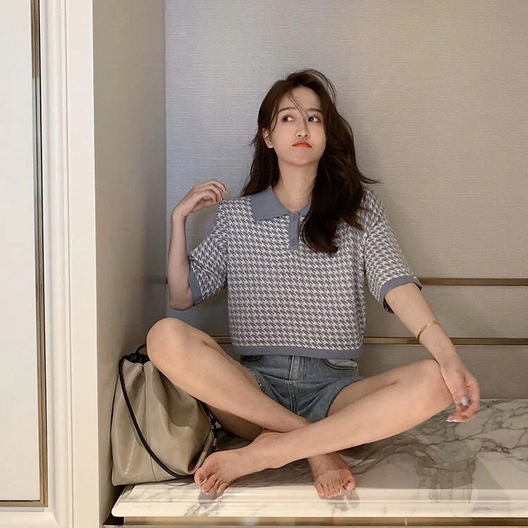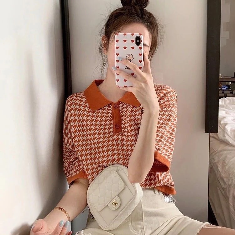 人气tシャツ 半袖 レディースポロシャツ レディース かわいい 千鳥柄 オレンジ ブルー ボーイッシュ 韓国 服 トップス カジュアル