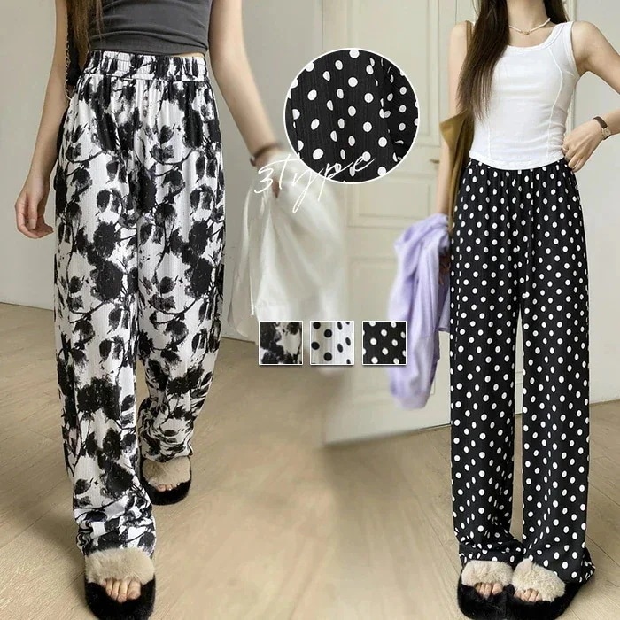 RUUワイドパンツ レディース 夏 薄手 涼しい UVカット UV 快適 花柄 総柄 柄パンツ 植物 水玉 ドット イージーパンツ ロング ワイド ガウチョ ロングパンツ ボトムス ズボン 長ズボン ルー