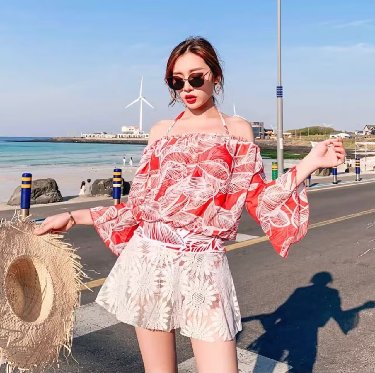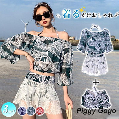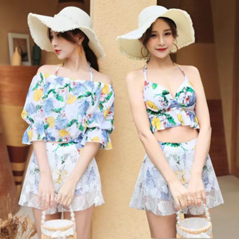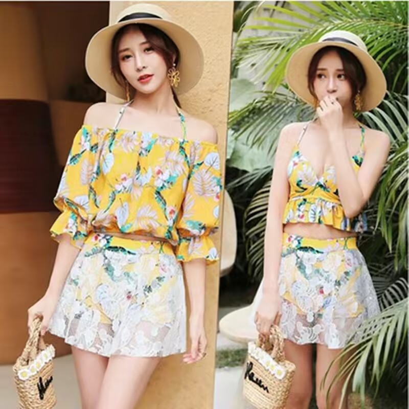 水着 レディース 体型カバー 3点セット ハイネック ビキニ 花柄 パレオ スカート リゾート韓国 ファッション おしゃれ 着痩せ 海水浴水着 レディース 体型カバー 3点セット ハイネック ビキニ