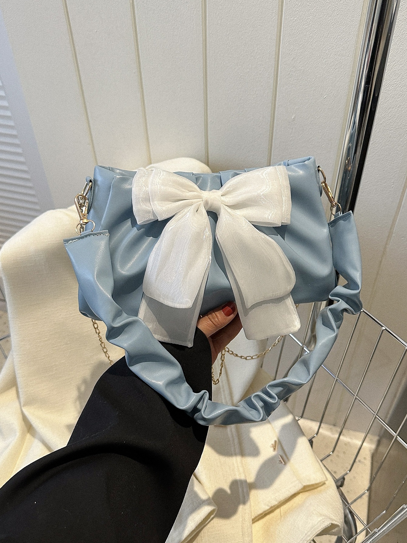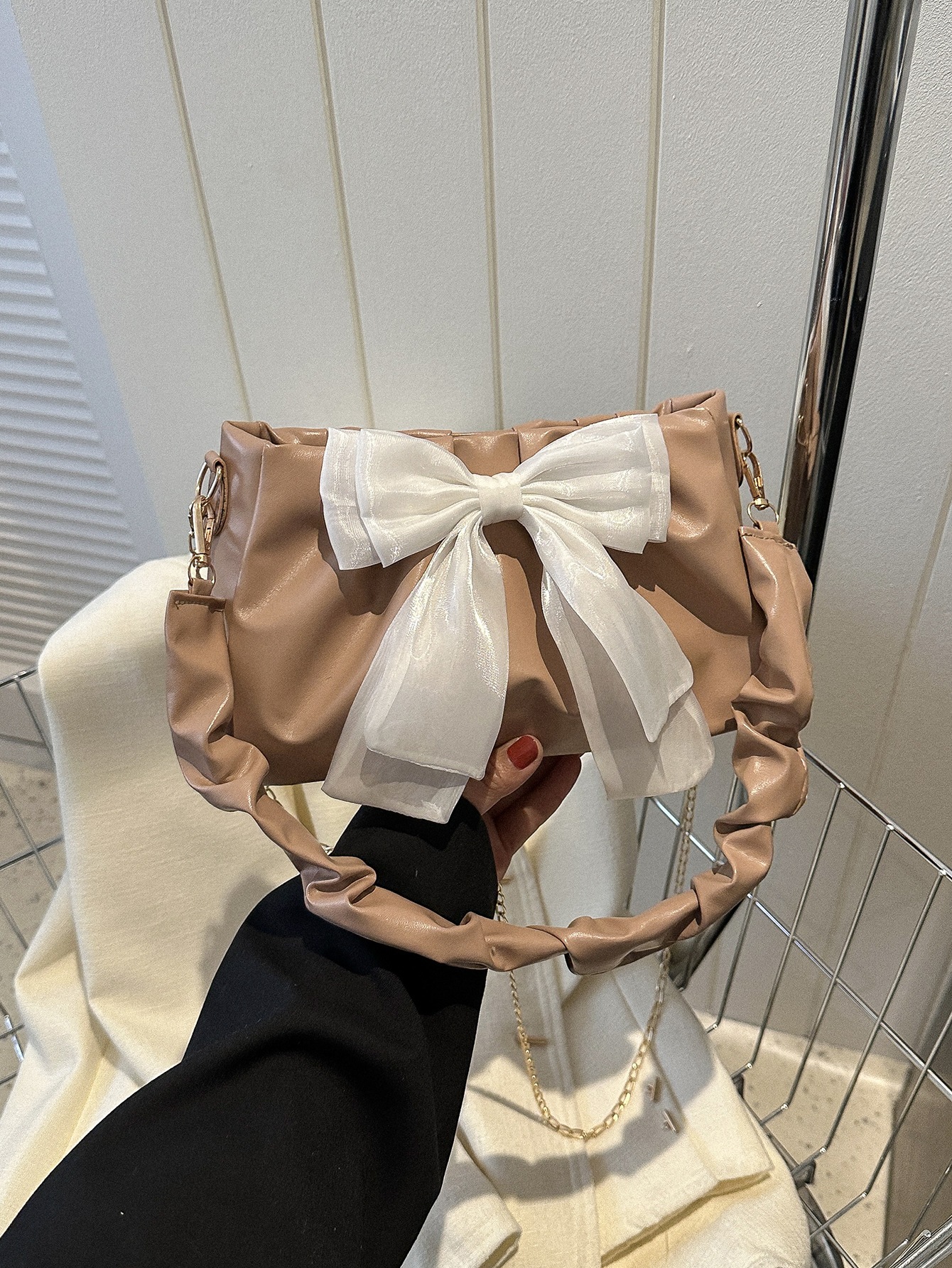 レディース リボン チェーンショルダーバッグ 折り目ミニバッグ 着脱式ストラップ