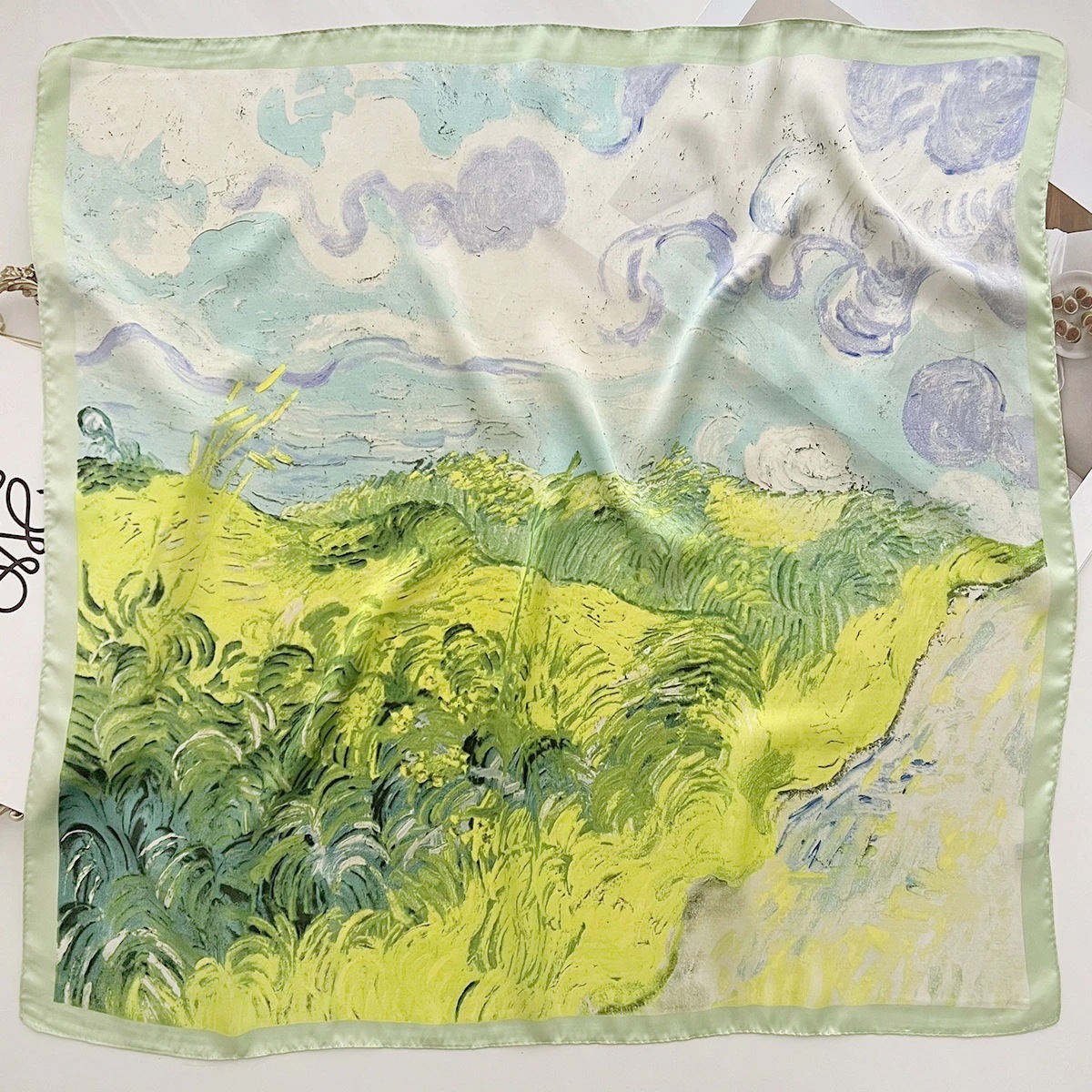 小さな新鮮な緑の油絵の印刷シルクスカーフ春と夏モデルのファッション70小さな正方形のスカーフヘッドスカーフは袋の髪ベルトベルトを結んだ