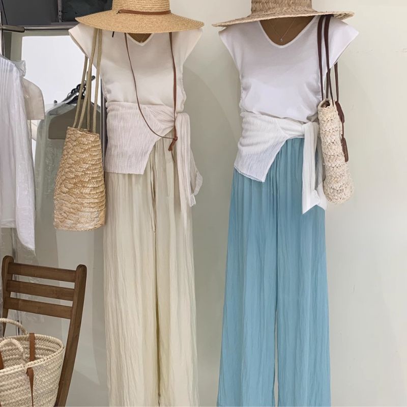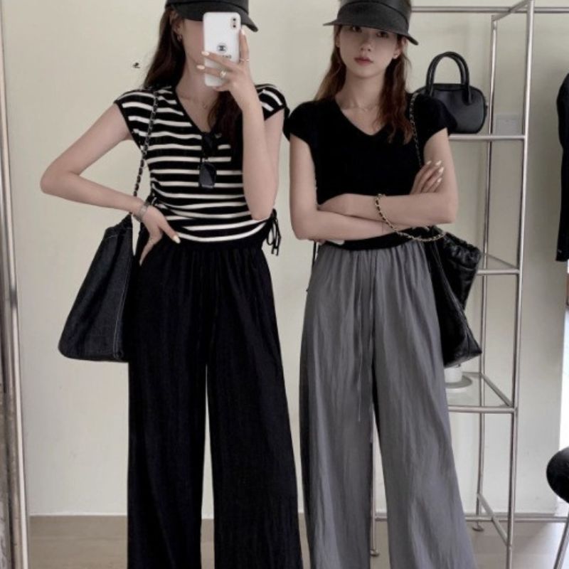 接触冷感ボトムス スラックスパンツ ためのハイウエストサテンアイスシルクワイドレッグパンツ2024夏の新しいスタイル薄いドレープフロアレングスカジュアル日焼け止めストレートパンツ 韓国ファッション