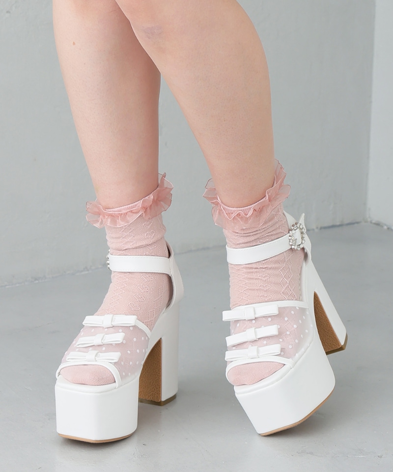 厚底 プラットフォーム ドットチュール 三連リボン ビジュー付きサンダル
