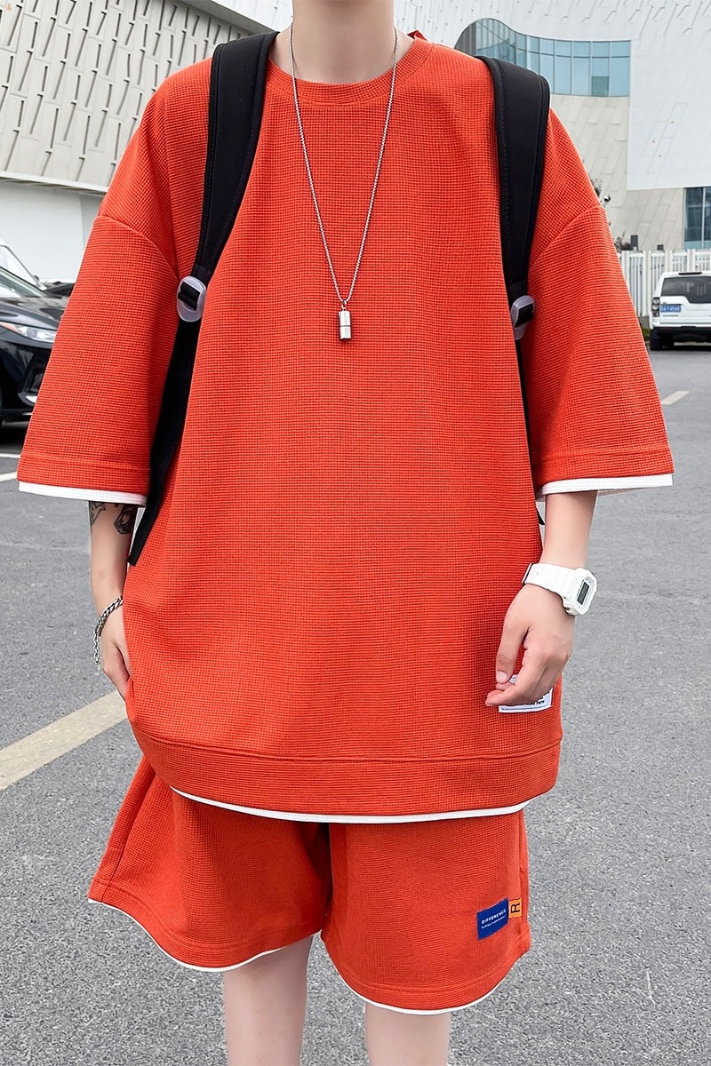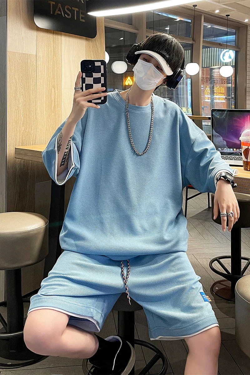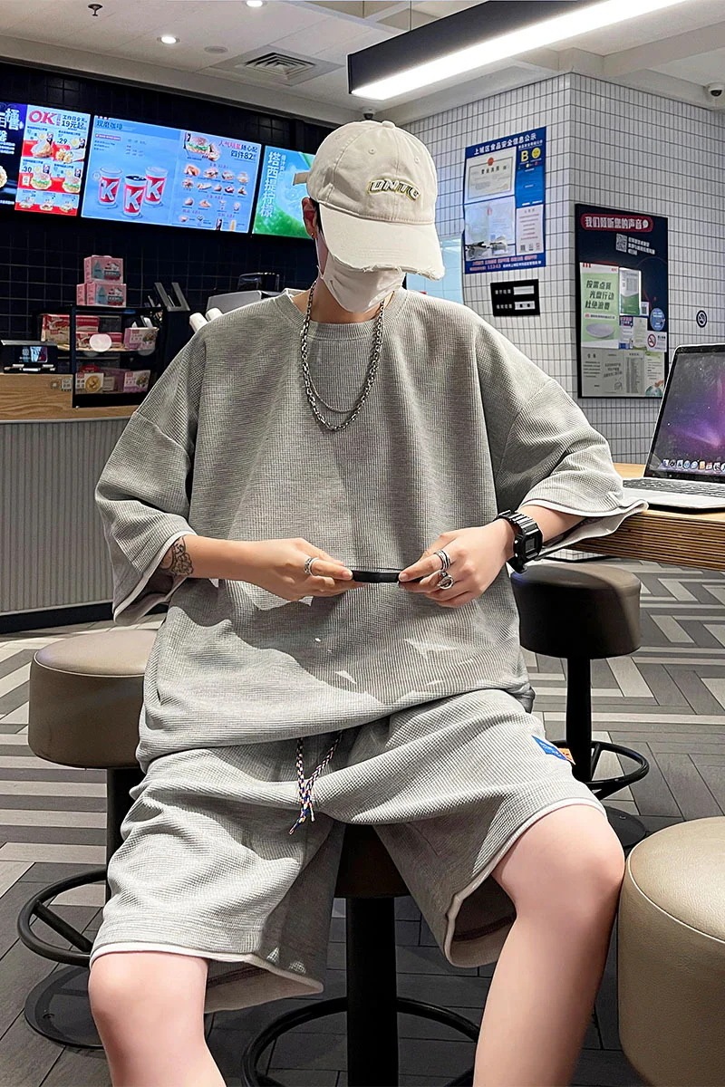 メンズ セットアップ ワッフルスーツ 夏 新作 半袖 ショートパンツ ゆったり カジュアル スポーツスーツ