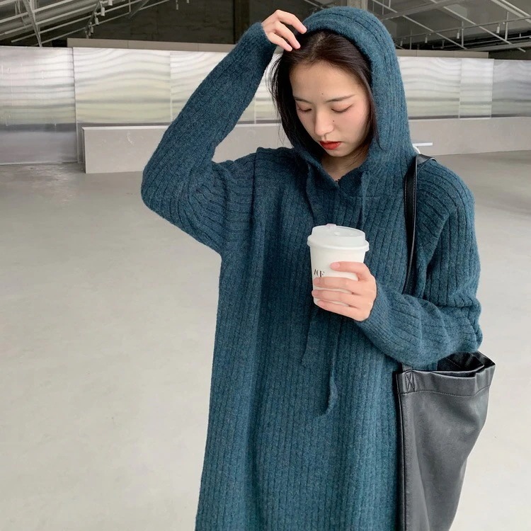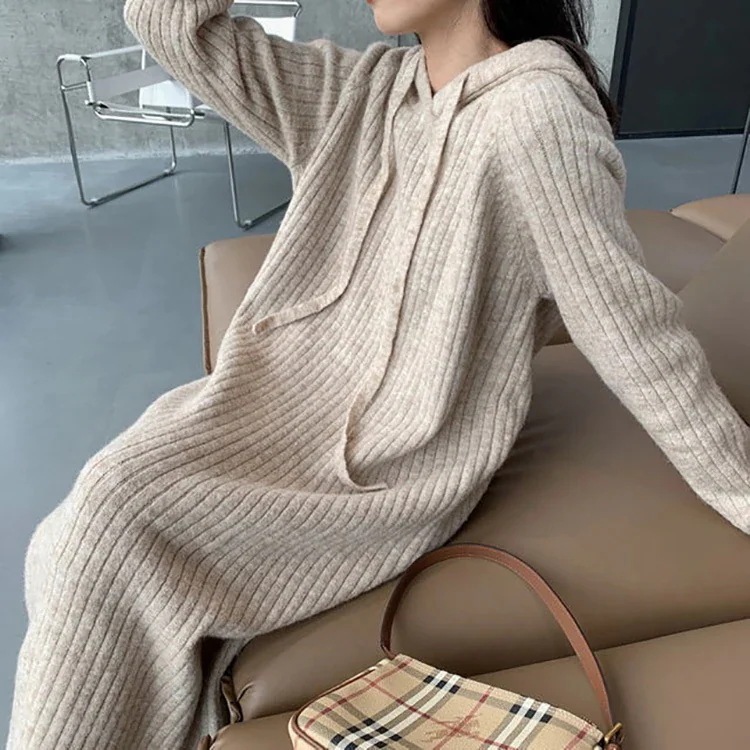 着痩せ ロング フード付きロングニットワンピースワンピース ワンピース 韓系 気質 ニットワンピース 新作 垂れ感 ドレス 韓国ファッション
