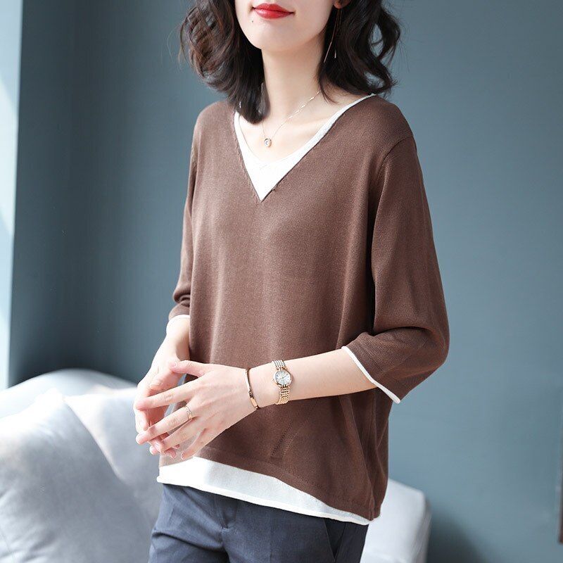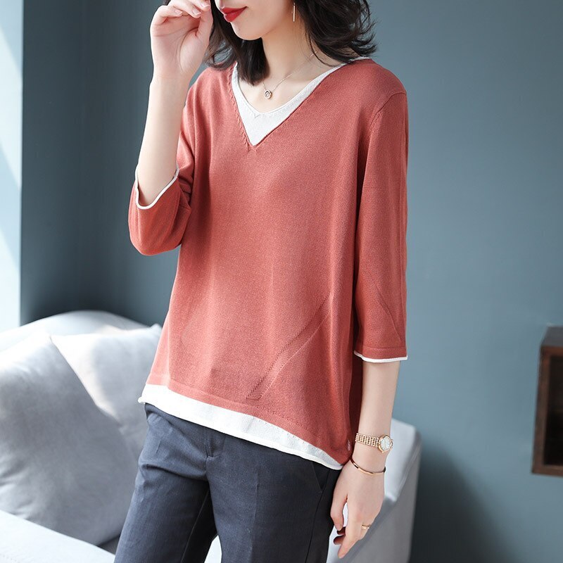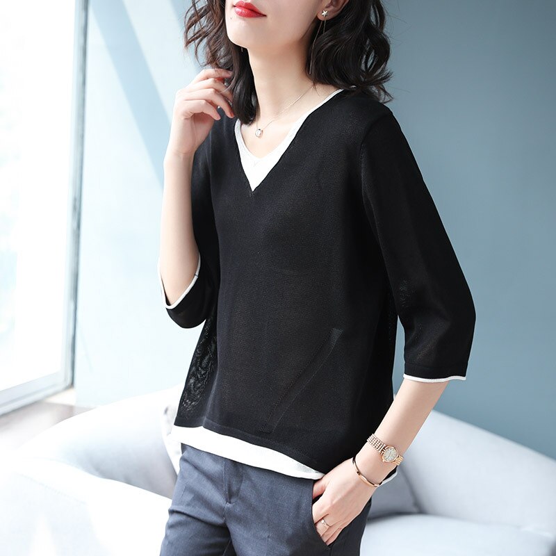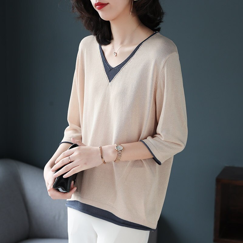 ゆったり トップスチュニック春アウター人気なリプニット 半袖Tシャツ Vネックコントラストカラー ニットカーディガン 新商品 春 タートルネックベーシックニット春 薄手 七分長袖