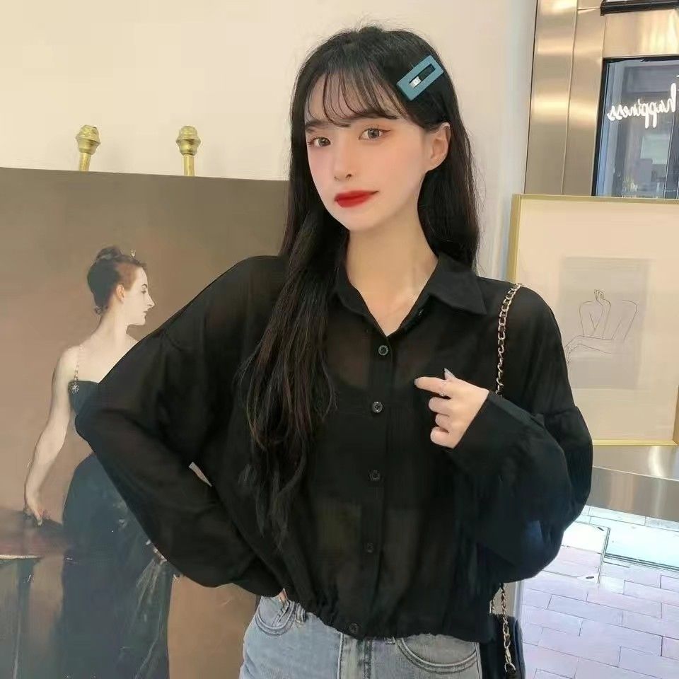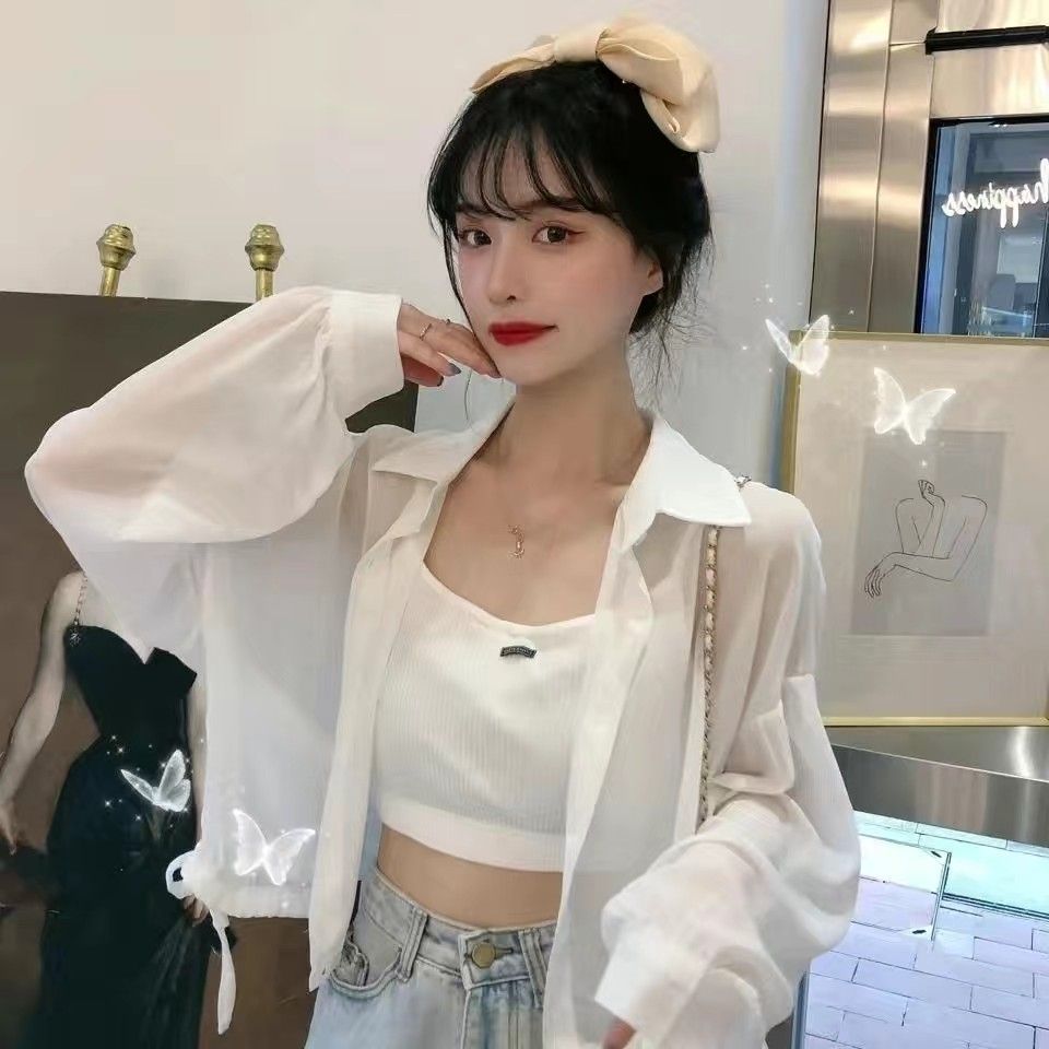 新型韓国版ゆったりショート丈日焼け止め女性夏薄手白い長袖シフォンシャツコート