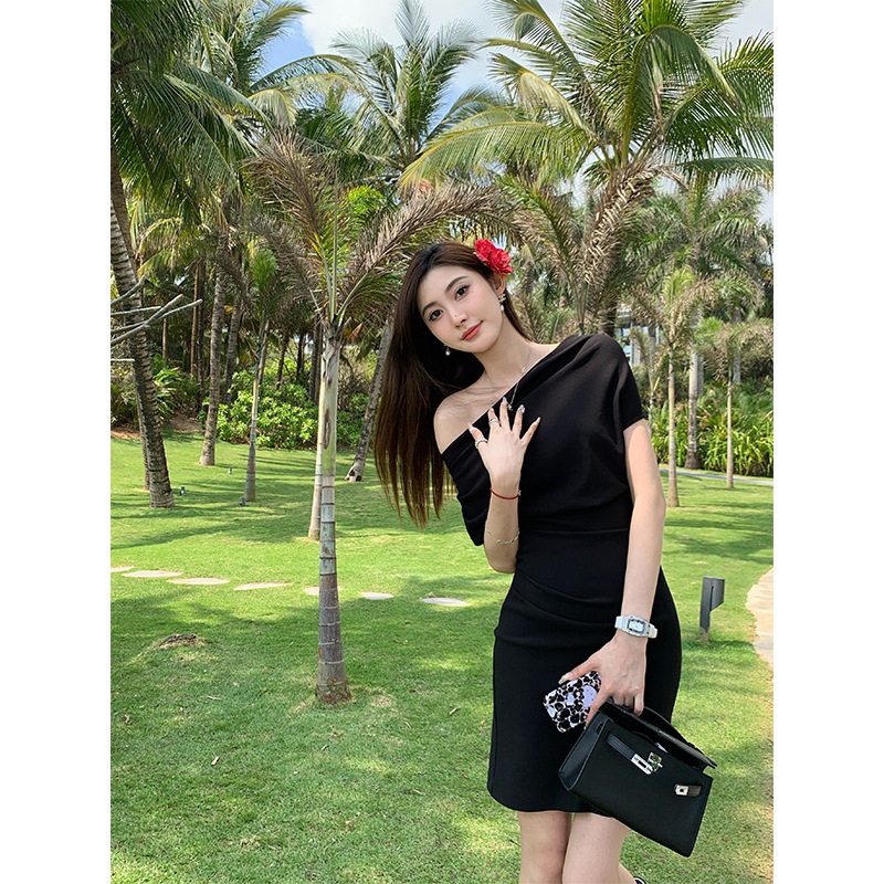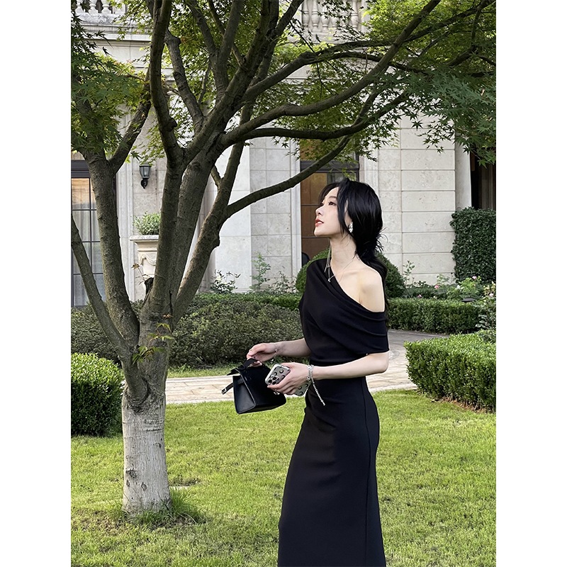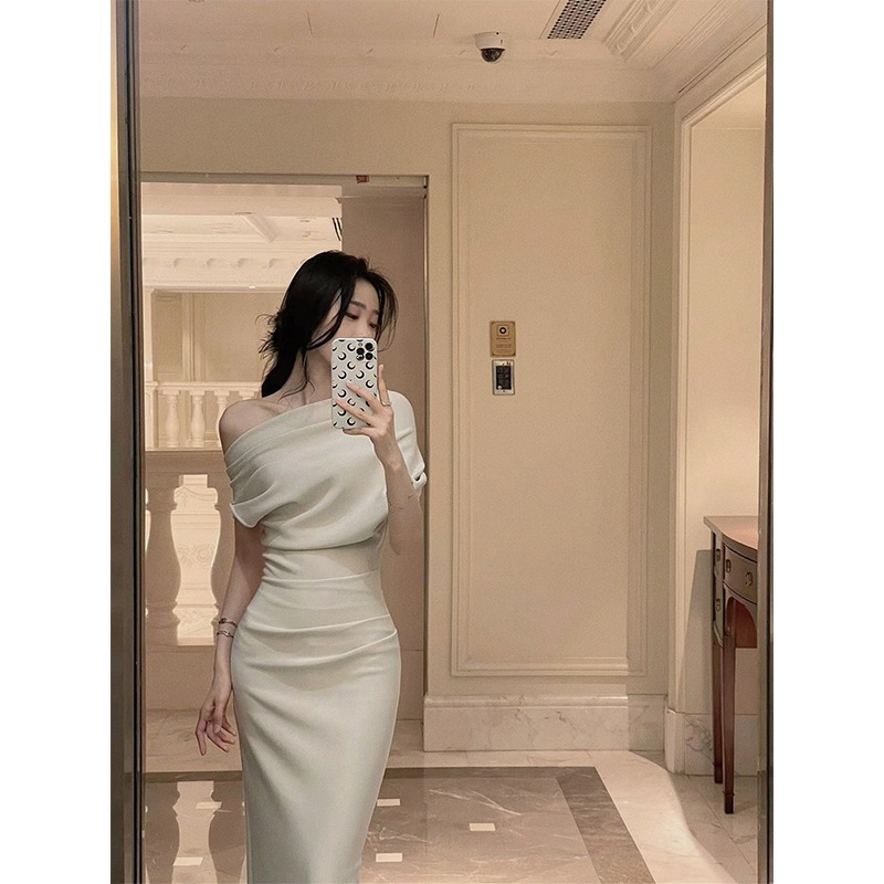 肩出しセクシーウエスト収め雰囲気プリーツワンピースレディース夏フレンチドレスロングワンピース