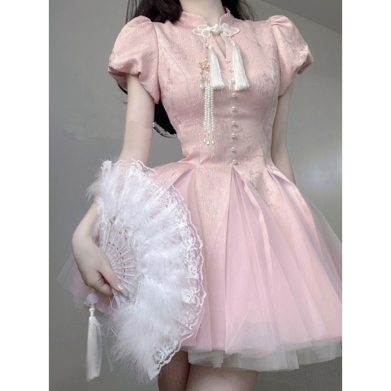 パーティードレス 新改良チャイナドレスピンクワンピースデザイン感プリンセススカート