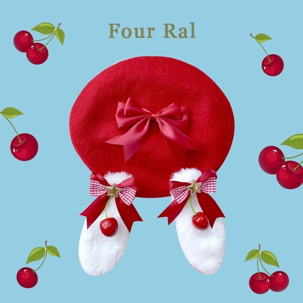チェリーリボンうさ耳ベレー帽ロリータウールペインタースイートリボンハット
