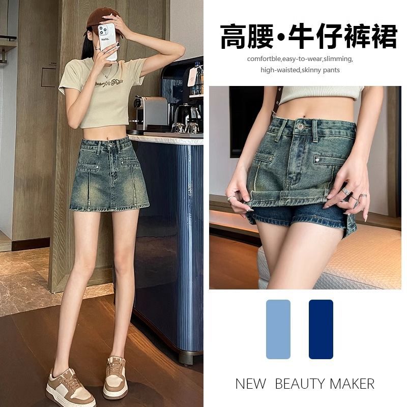 レトロなハイウエストジーンズスカートデザインハイストリート万能ショートスカート2025ヒップカバーヒップスカート露出防止