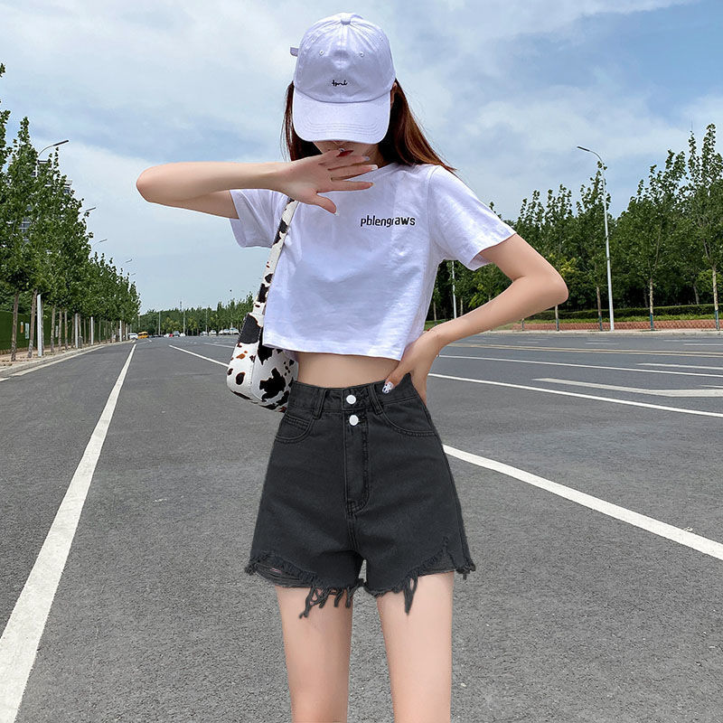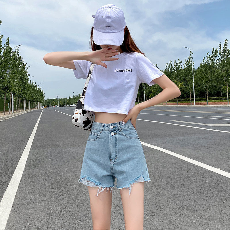 ライトブルー ハイウエスト Aライン デニム ショートパンツ レディース 夏 薄手 破れ ゆったり スリミング 大きいサイズ ファット MM ホットパンツ トレンディ イン
