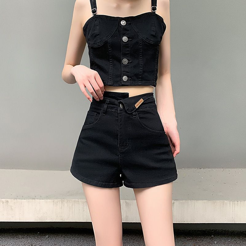 ファッショナブルで多用途な女性用ブラックデニムショートパンツ2025不規則なハイウエストスリムホットガールストレッチホットパンツ夏のトレンド