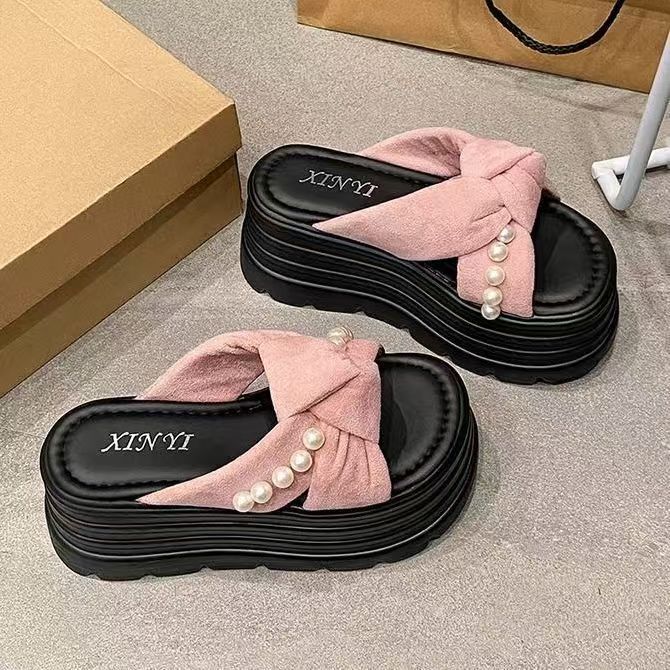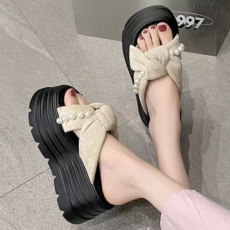 女性の外で厚底サンダル韓国ファッション 美脚 クロス サンダル レディース サンダル シューズ 靴ミニ百合真珠とスカートの涼しいスリッパを履いて