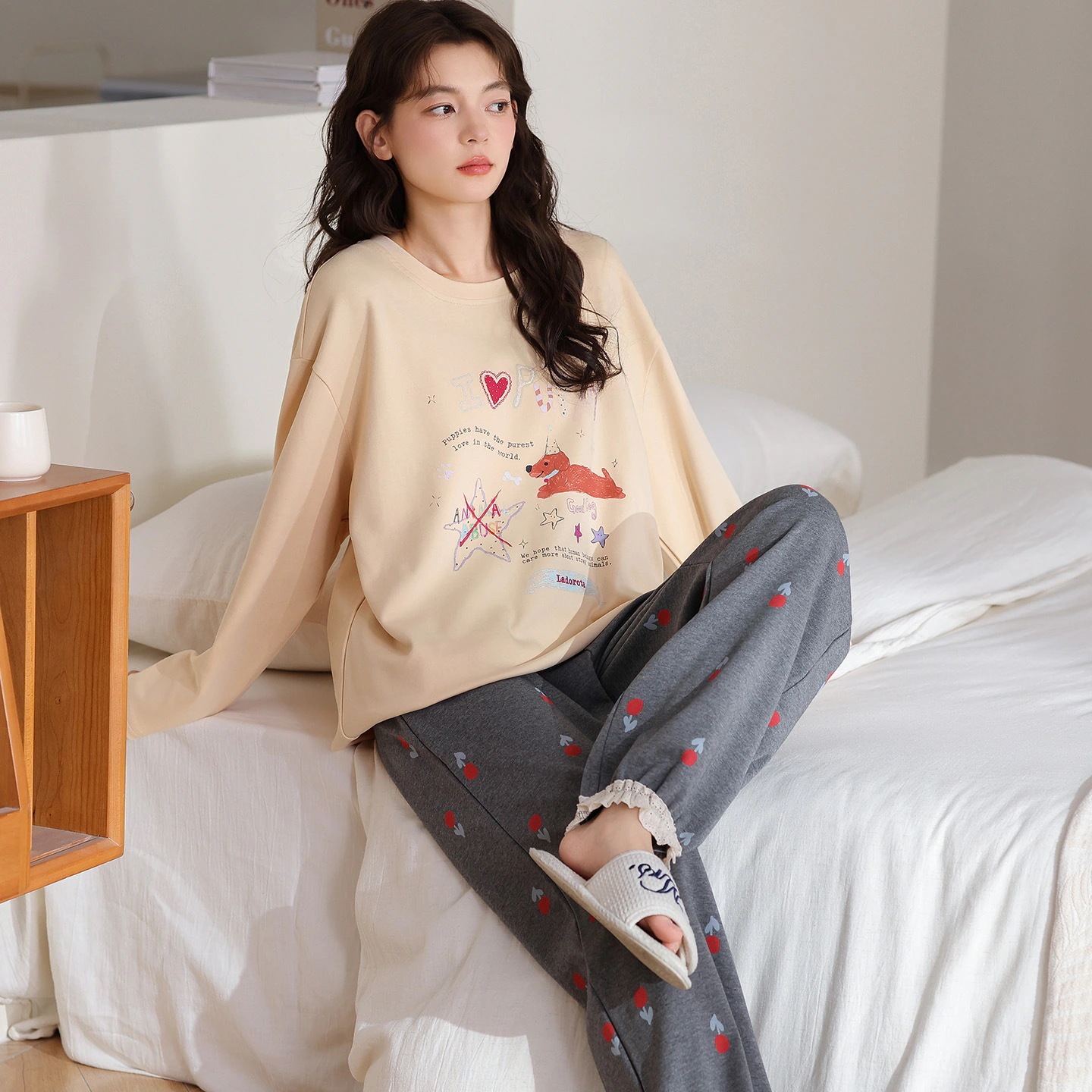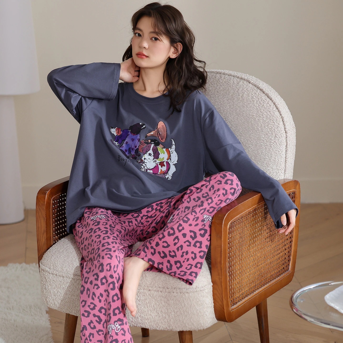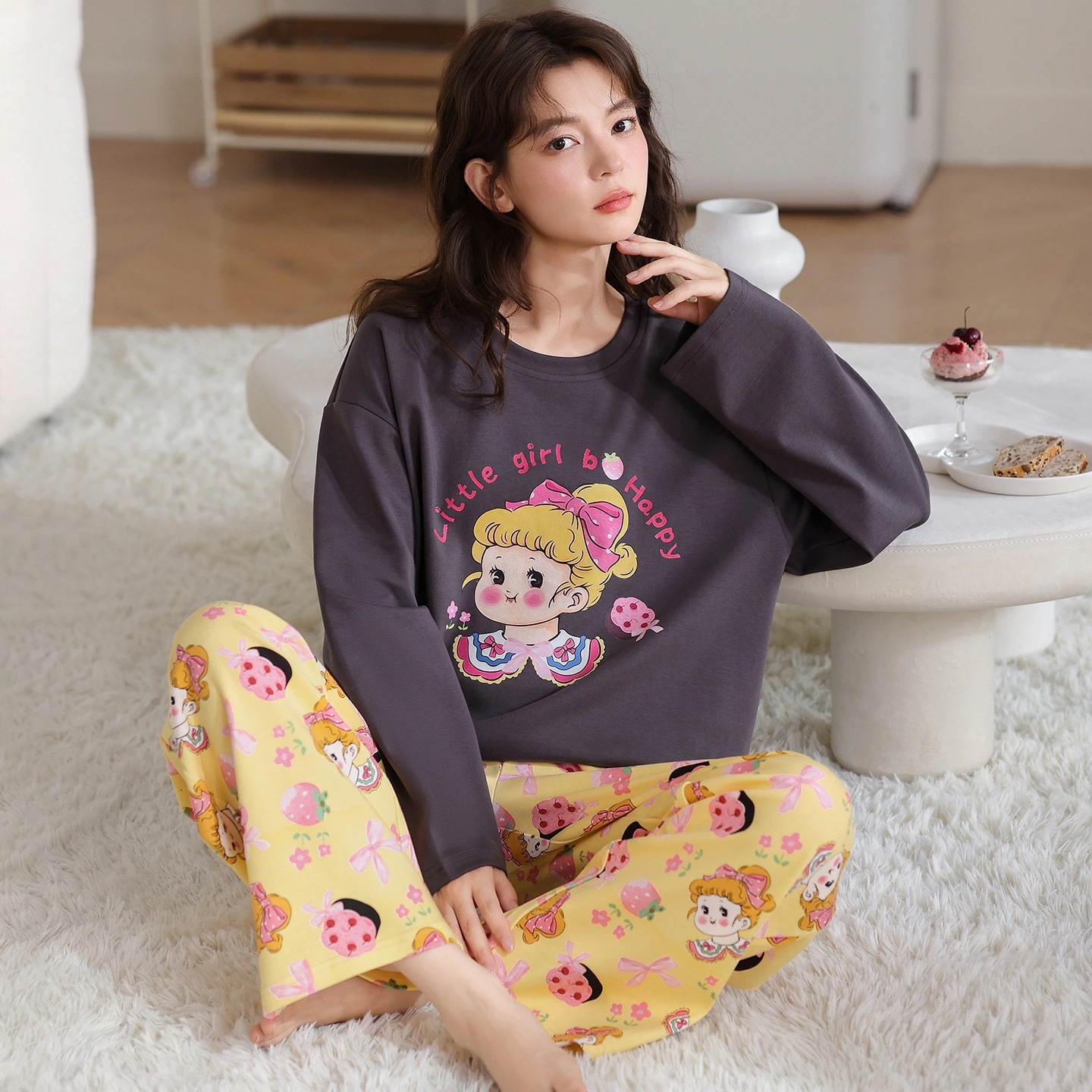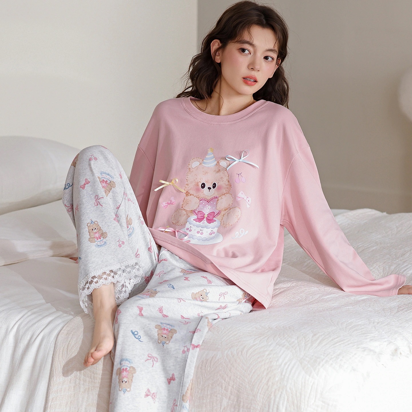 韓国風 冬・秋用 長袖パジャマ 女性用 キュート キャラクター 女性用 丸首 ルームウェア 2点セット 外着可能